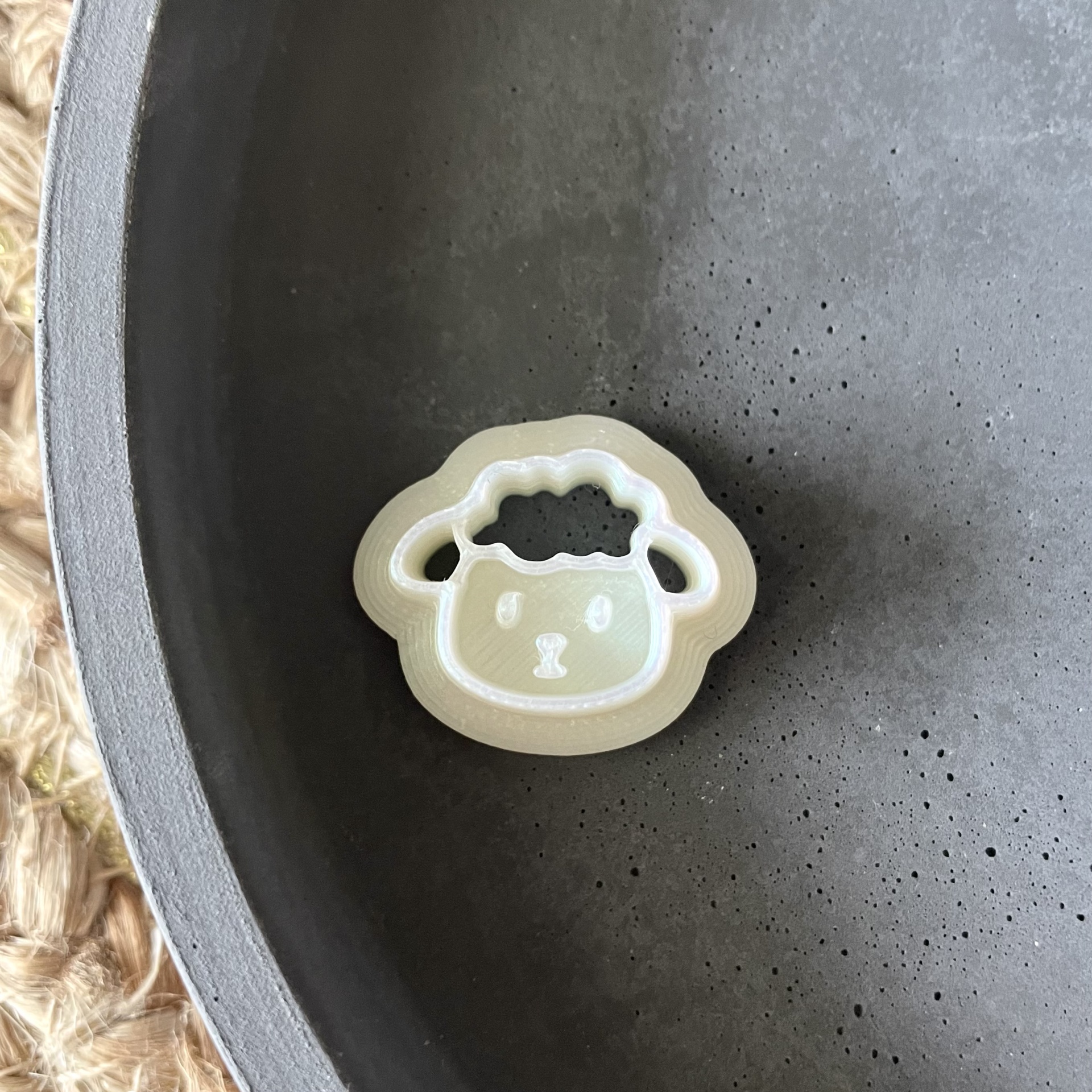 • Objeto em formato de ovelha branco e bege dentro de uma tigela cinza escuro