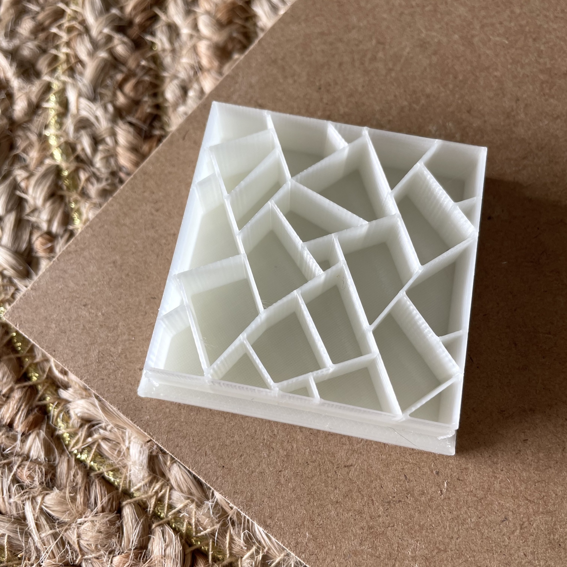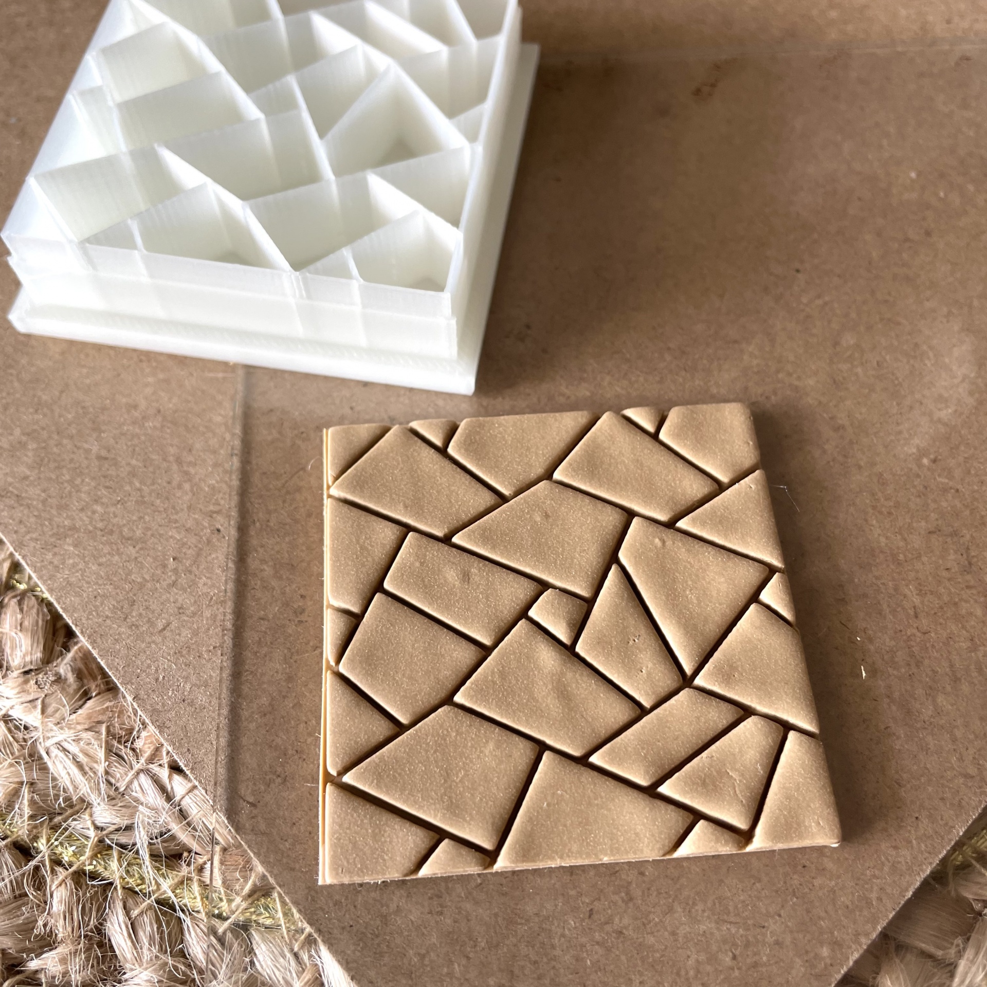 • Molde plástico branco e peça quadrada de couro bege com padrão geométrico