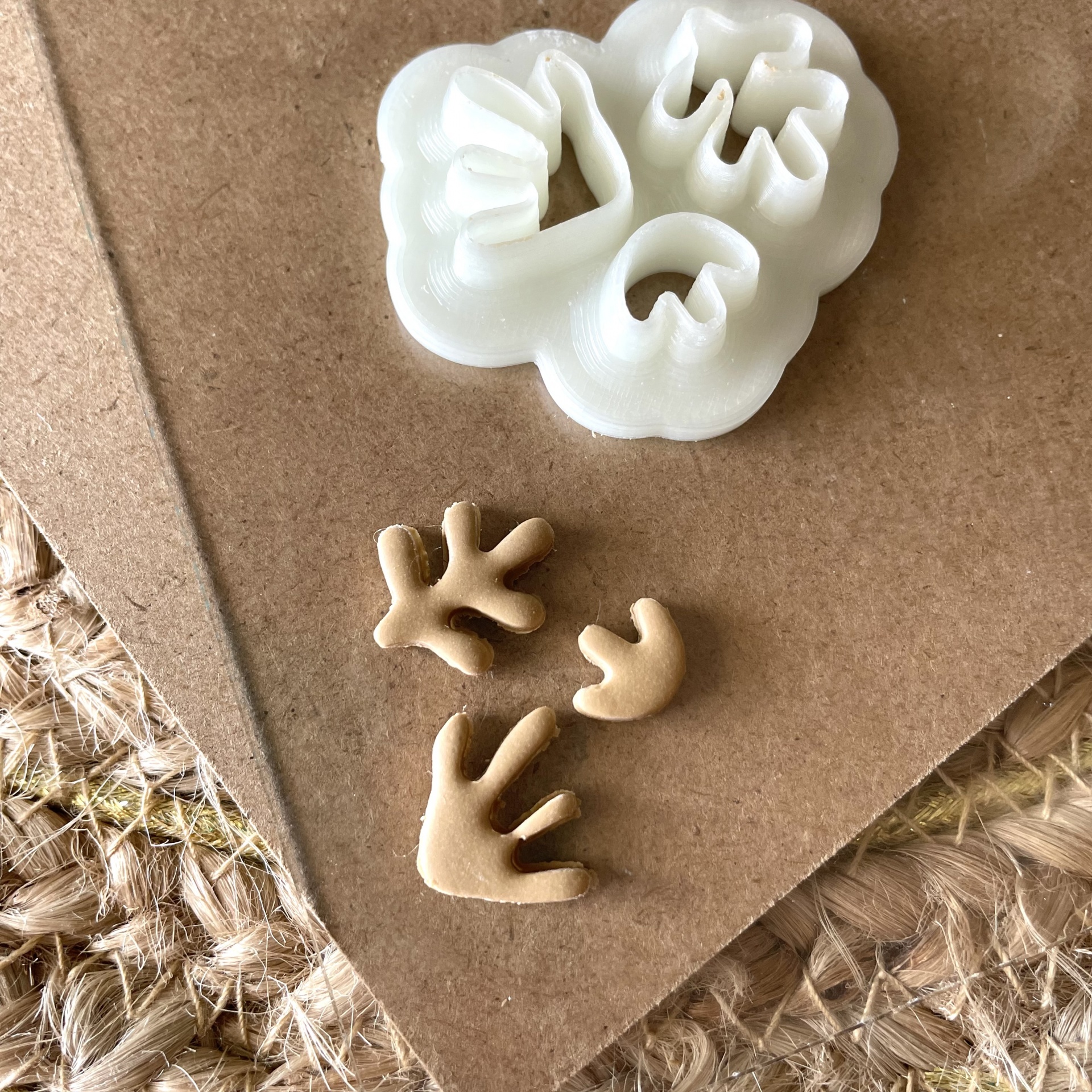 • Molde branco de plástico com formas de folhas e objetos castanhos em forma de folhas sobre cartão e tecido