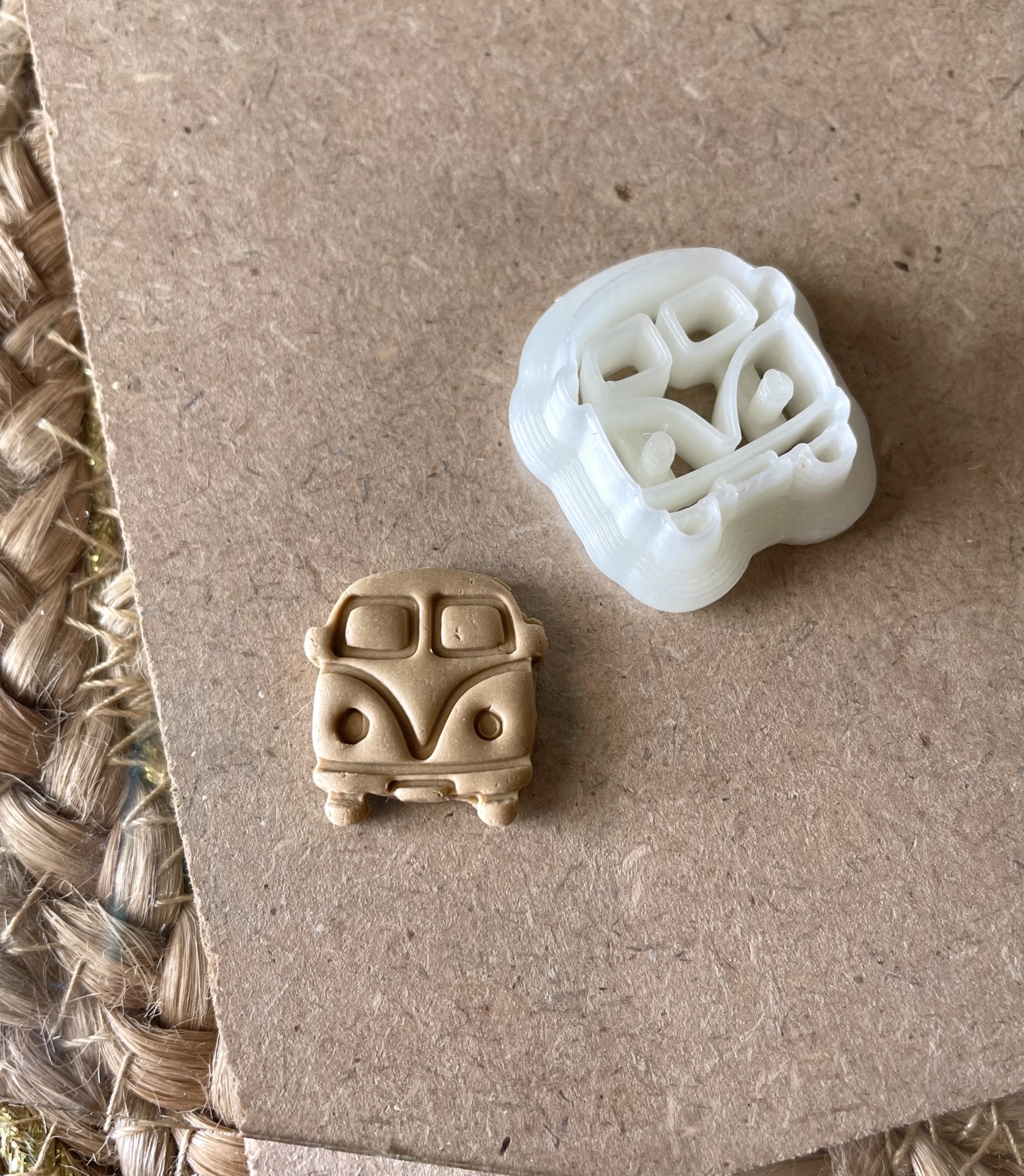• Miniatura de furgão bege e peça plástica branca sobre superfície castanha e tecido trançado