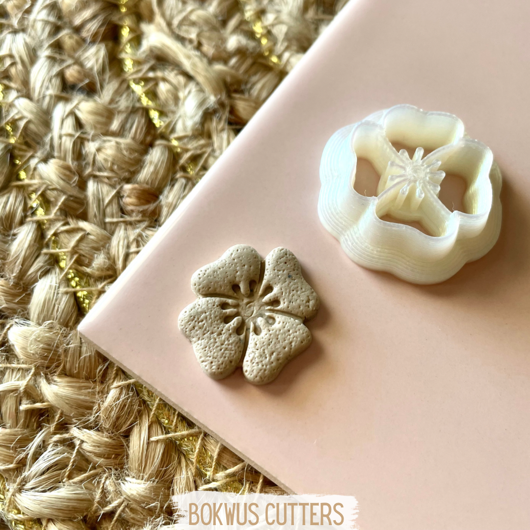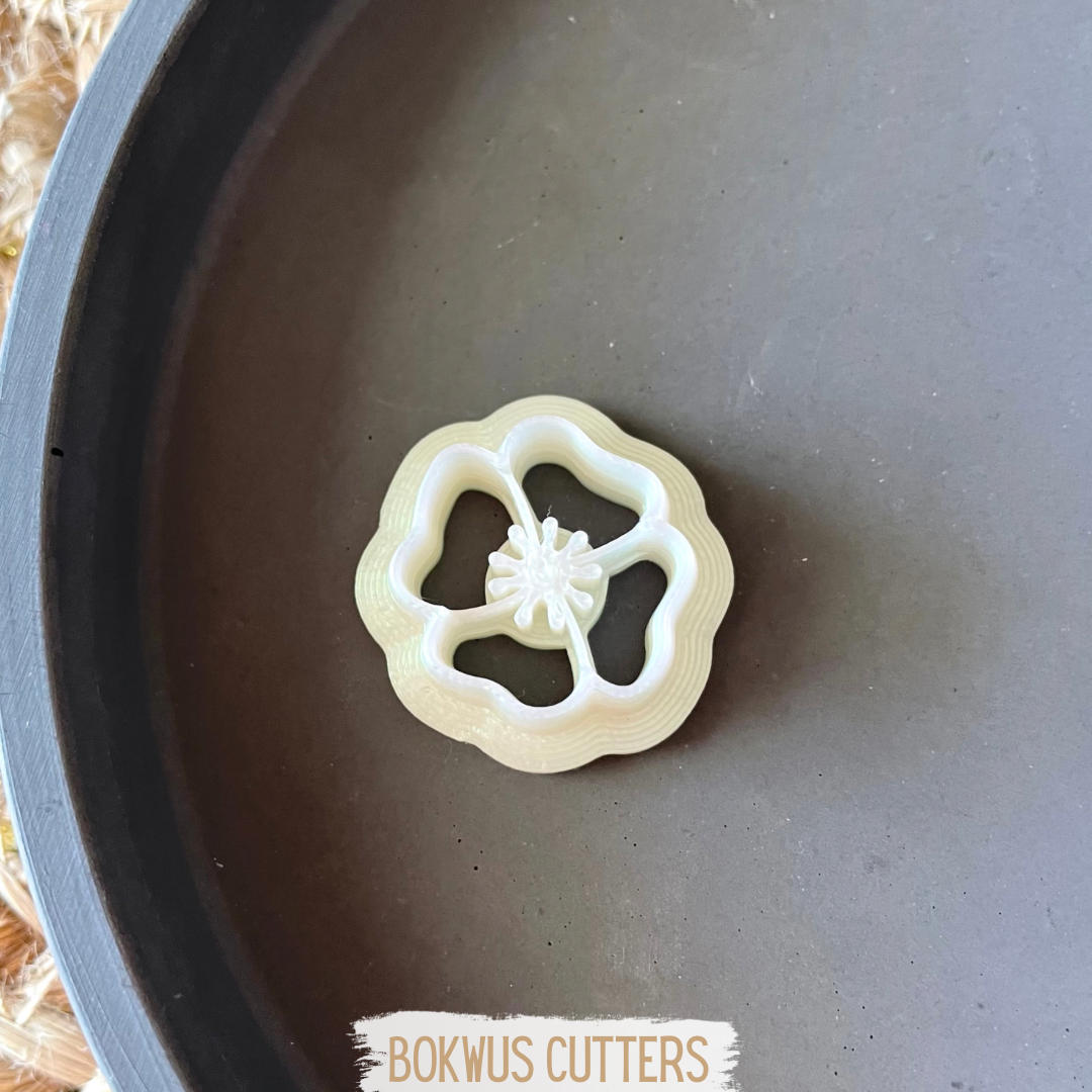 • Cortador de bolachas em formato de flor branco sobre superfície cinzenta