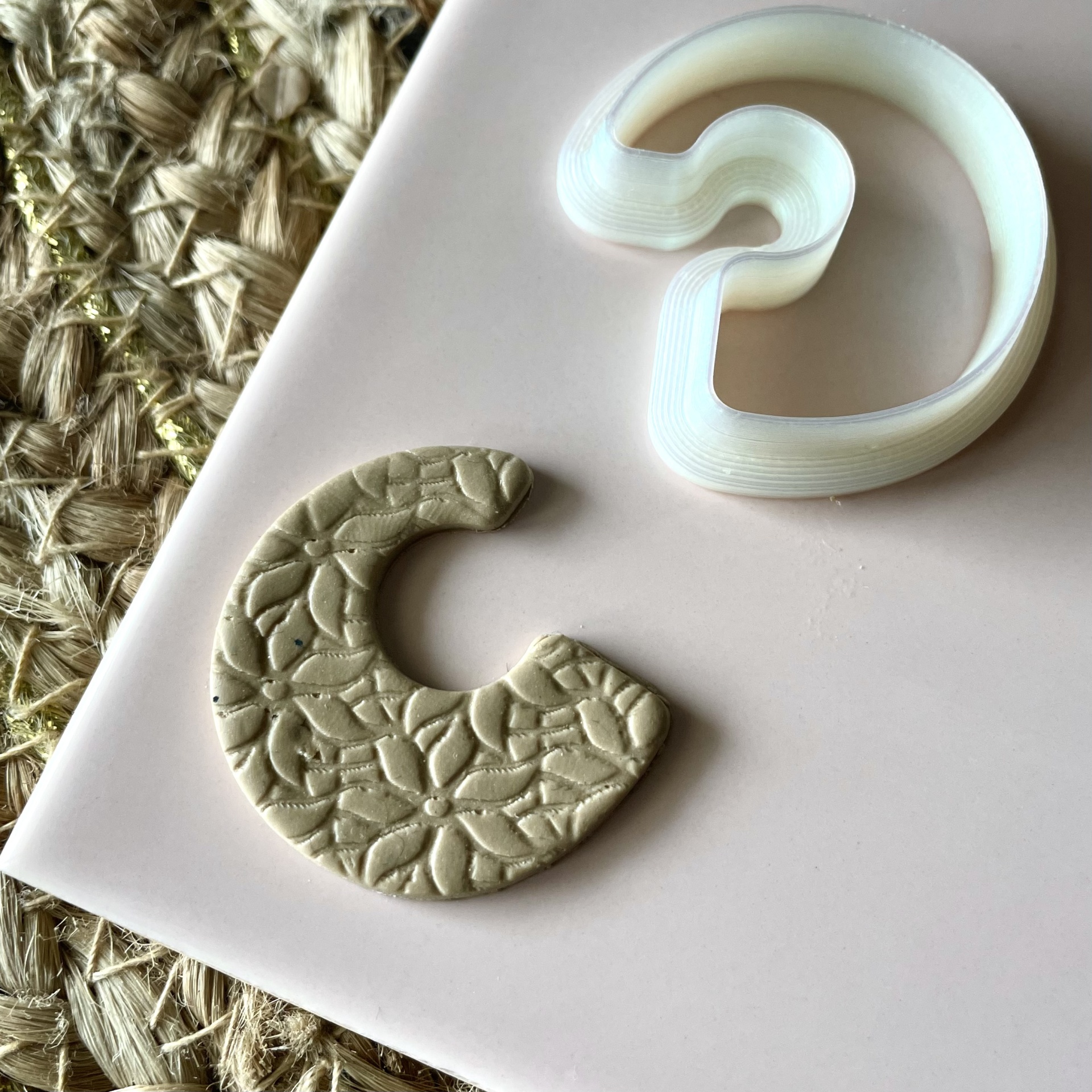 • Dois brincos em forma de C, bege com floral e branco translúcido.