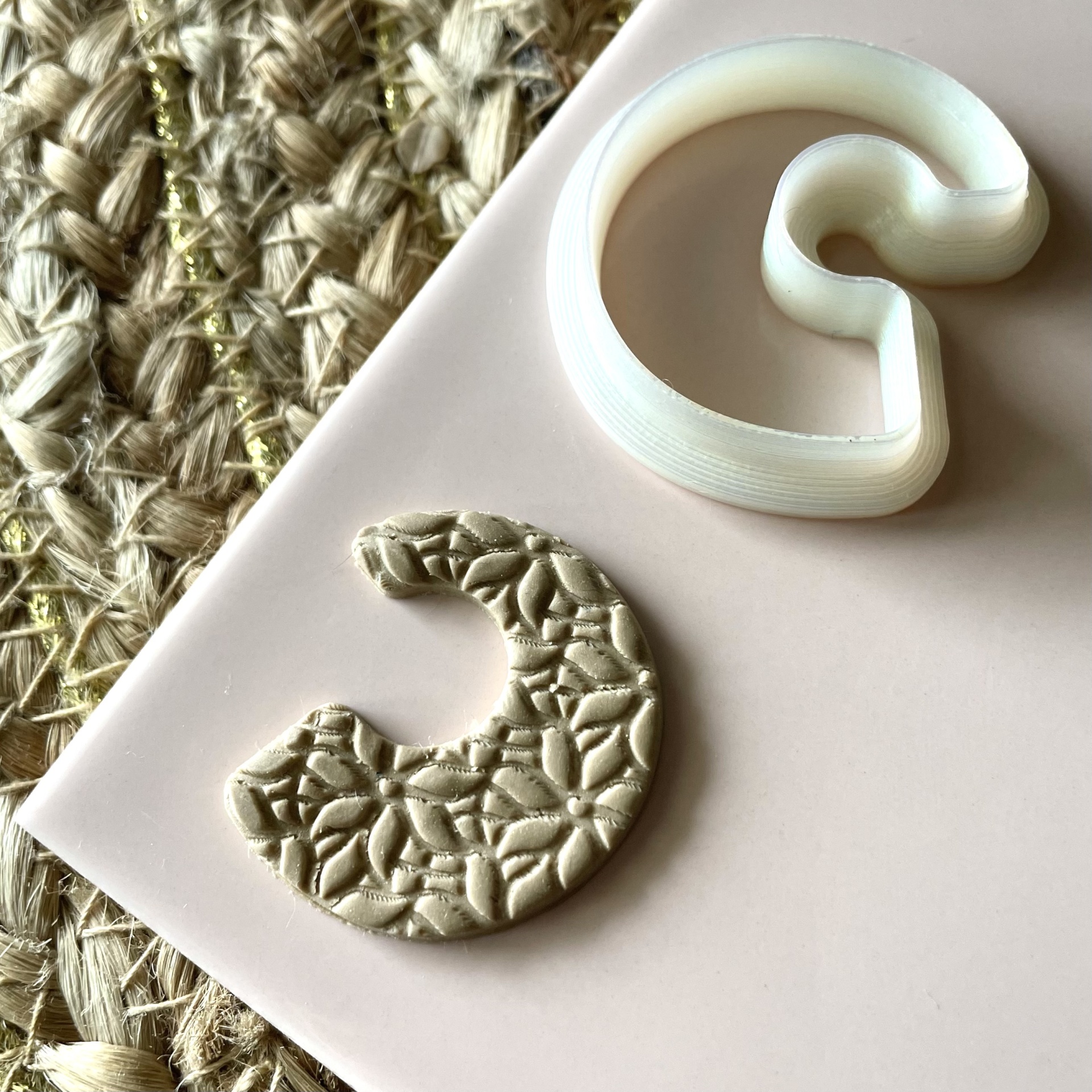 • Forma de silicone branca e peça decorativa em 'C' com textura floral sobre superfície branca e tapete de fibras naturais