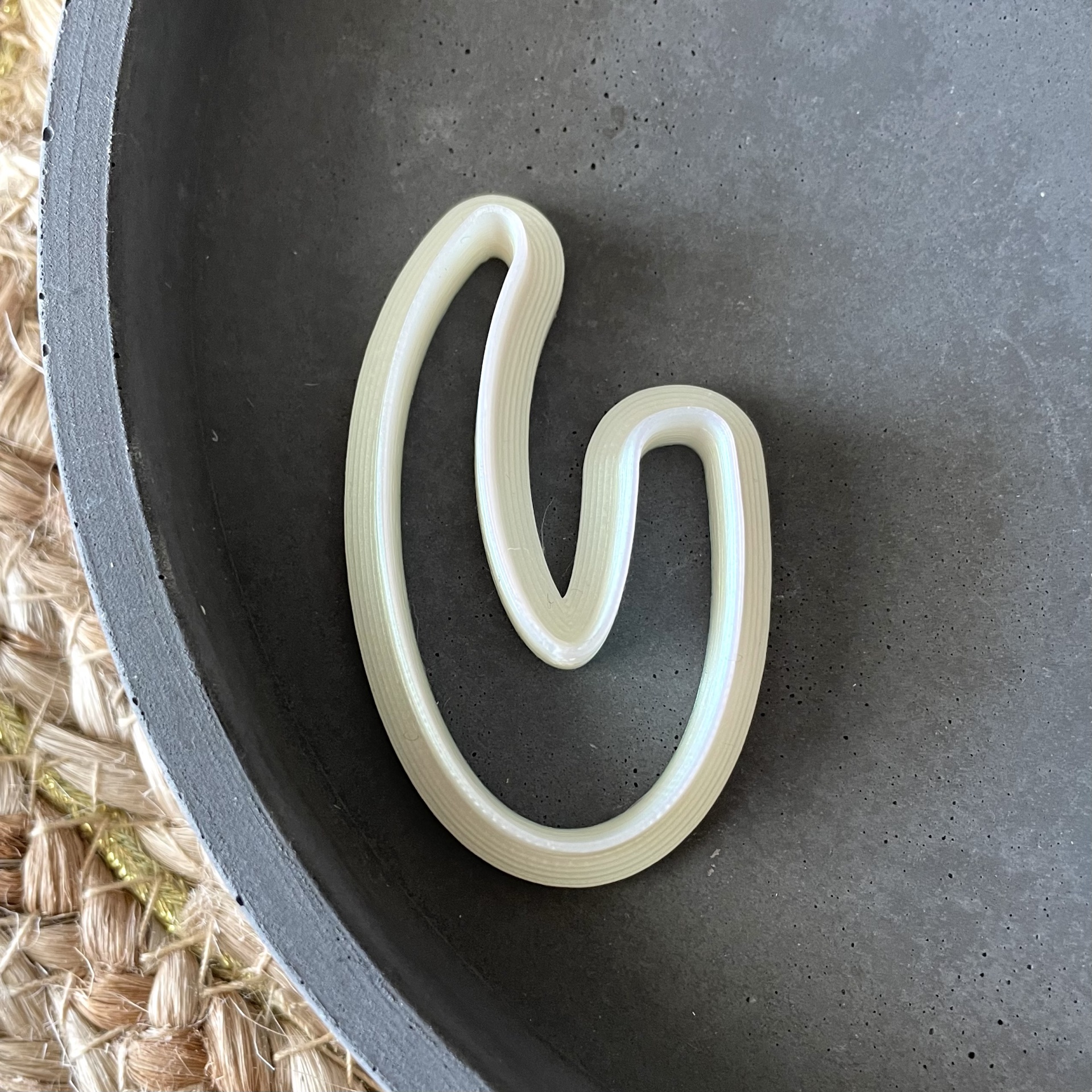 • Clip creme canelado num prato cinza fosco sobre superfície trançada
