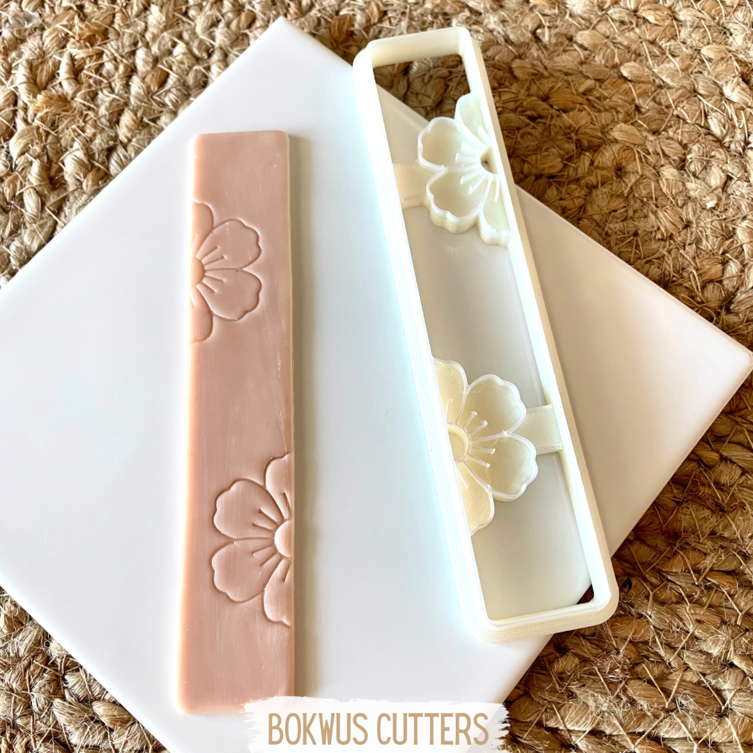 • Cortador de biscoitos branco com desenho floral e massa rosa estampada sobre tabuleiro branco