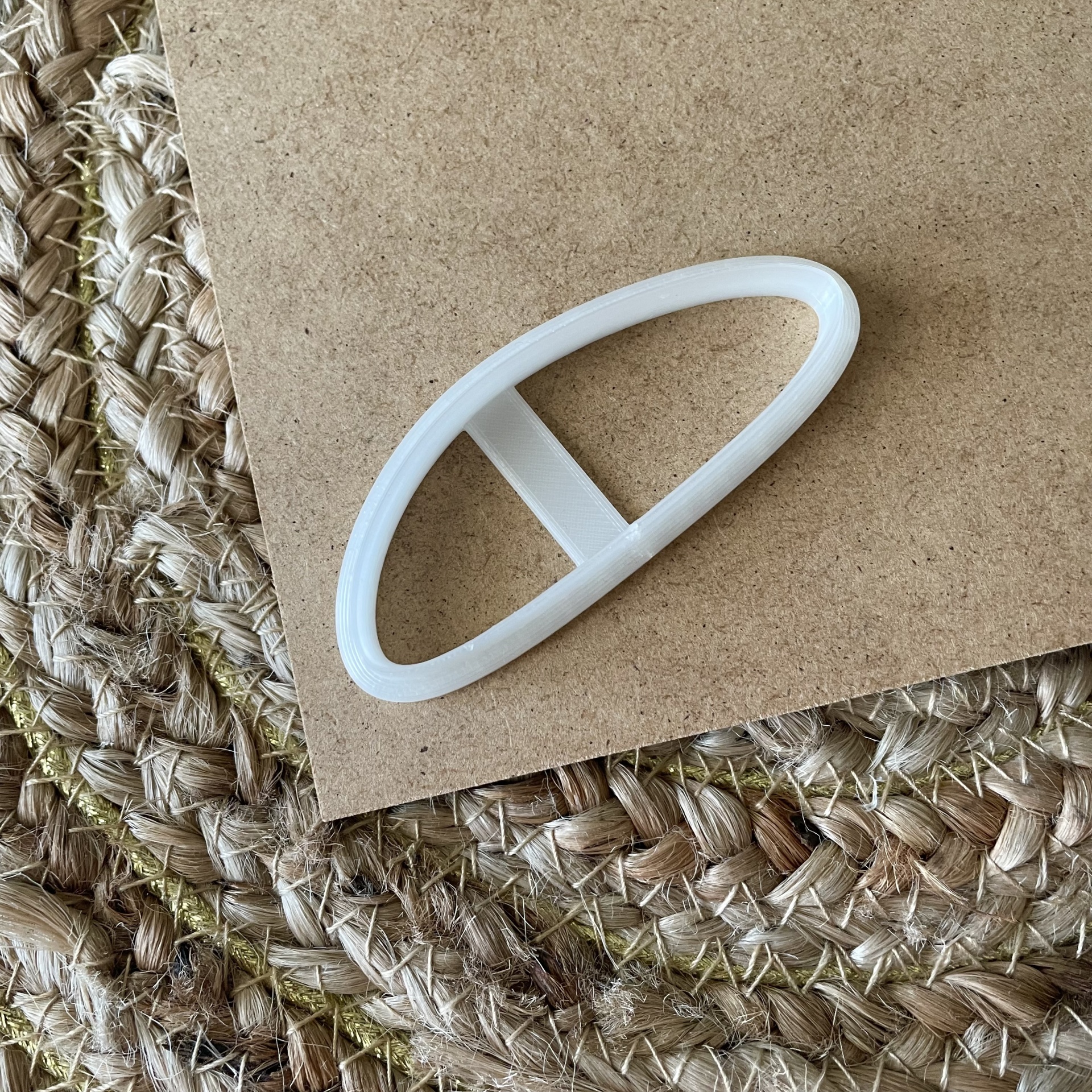 • Cortador oval branco de plástico e pedaço de pasta castanha com relevo ornamental sobre superfície de madeira e tapete entrelaçado.