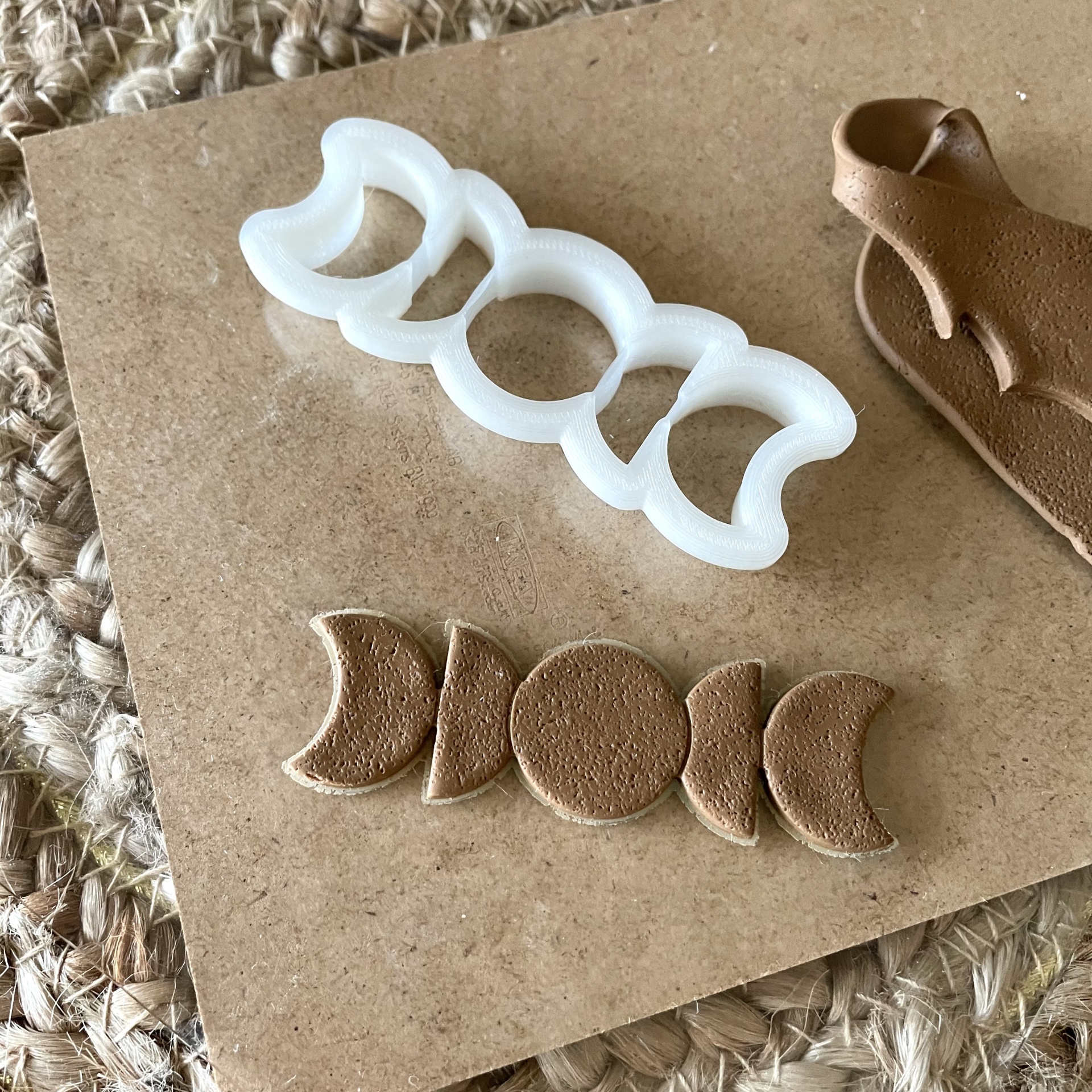 • Cortador de bolachas em forma de fases da lua em plástico branco sobre madeira e tapete de juta