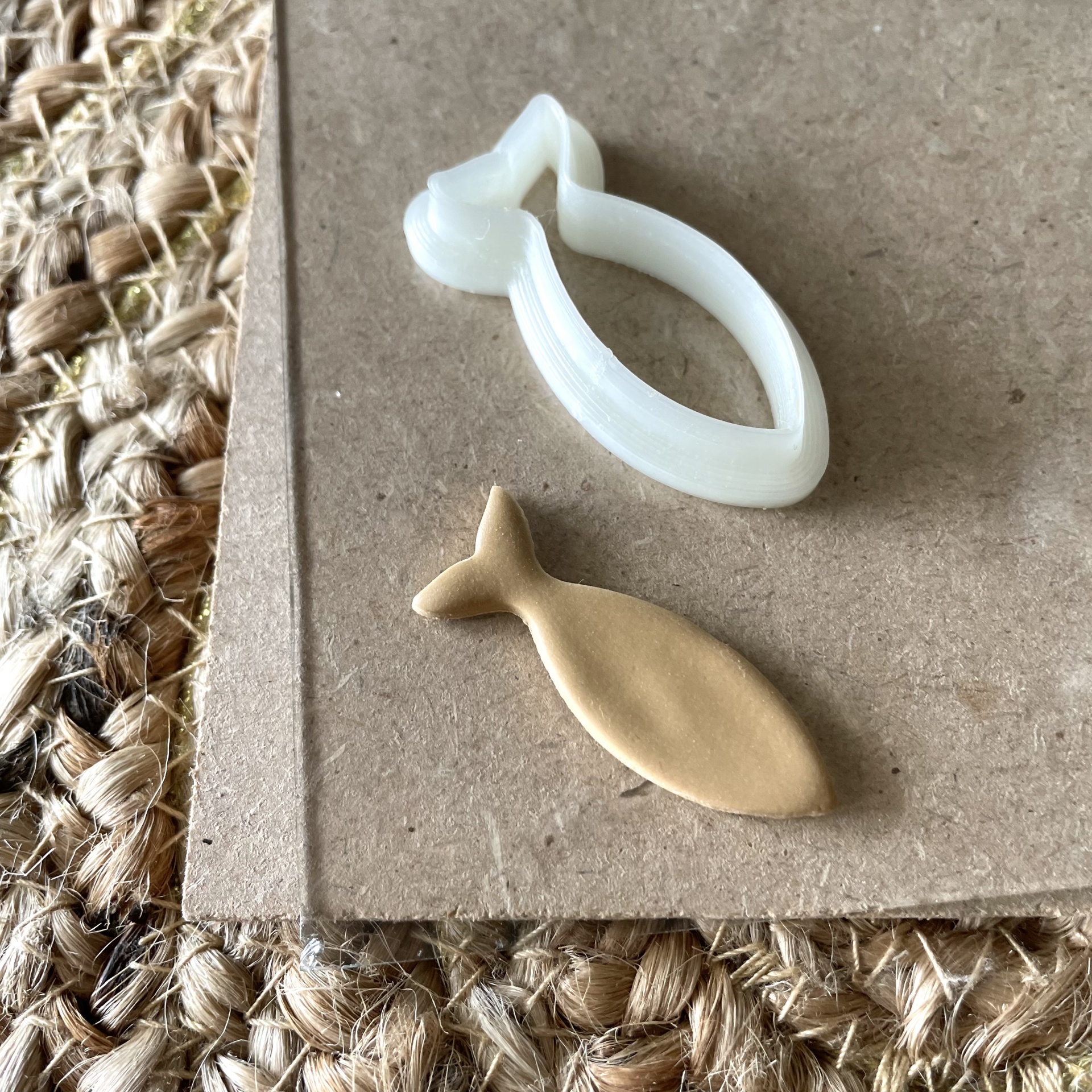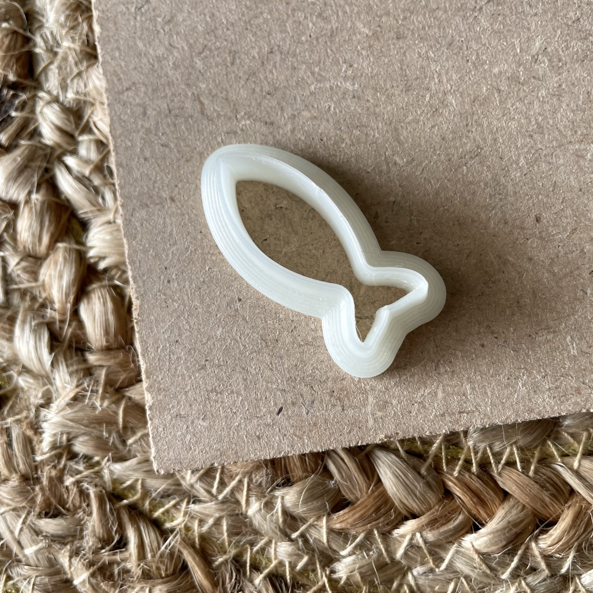 • Cortador de biscoitos plástico branco em forma de peixe sobre cartão e base de juta