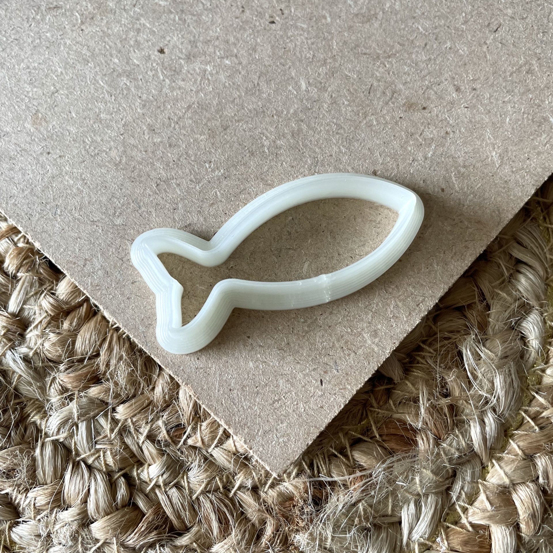 Cortador de biscoitos branco e biscoito dourado em forma de peixe sobre cartão castanho e tapete de fibras naturais