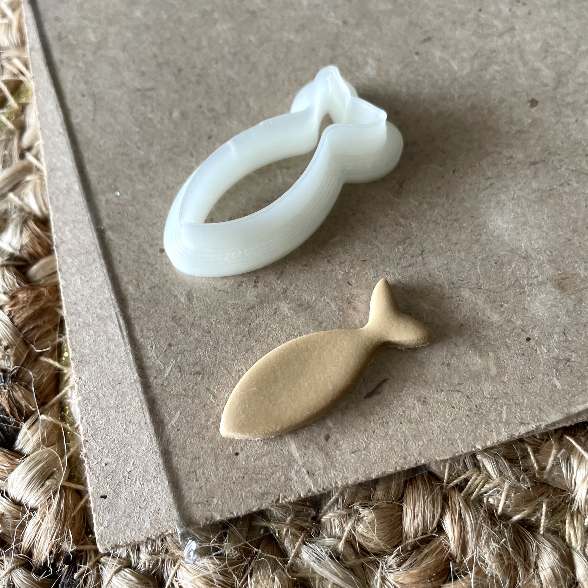 • Cortador de biscoitos branco e biscoito dourado em forma de peixe sobre cartão castanho e tapete de fibras naturais