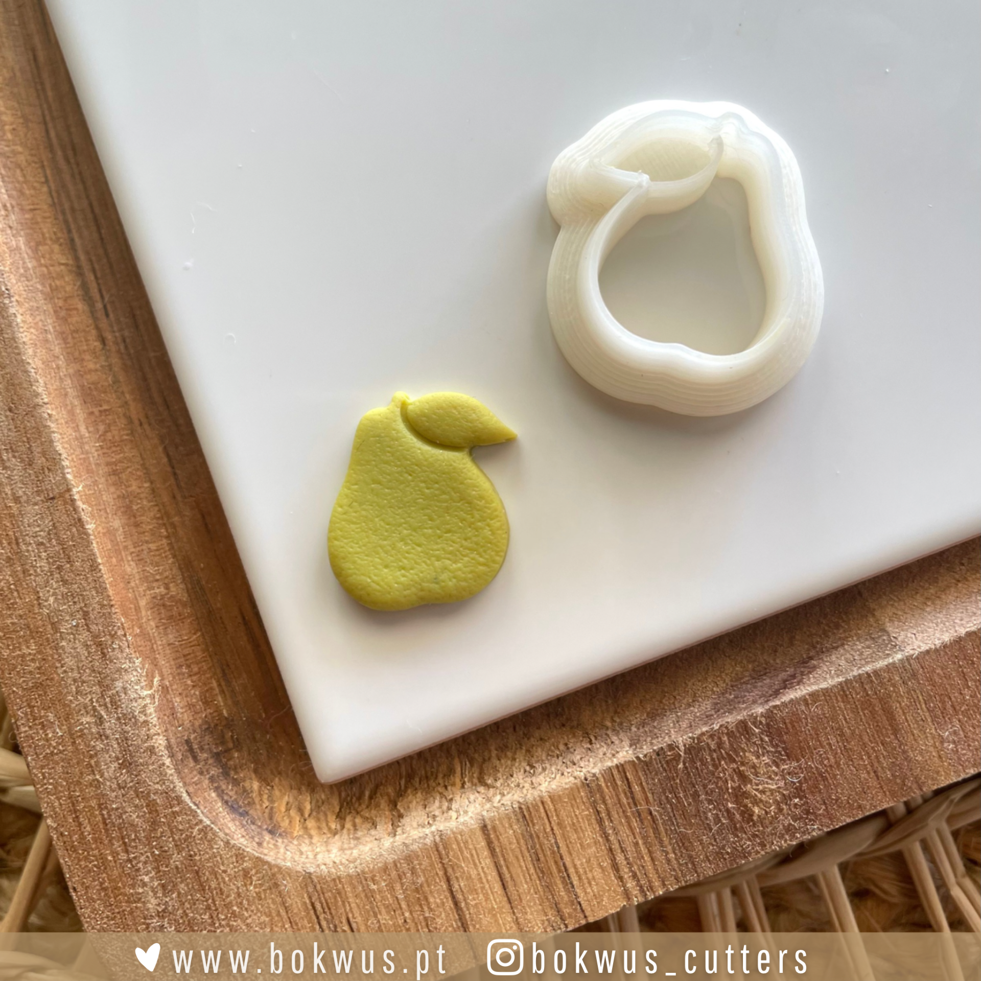 • Cortador de bolachas em forma de pêra com bolacha amarela e tábua de madeira
