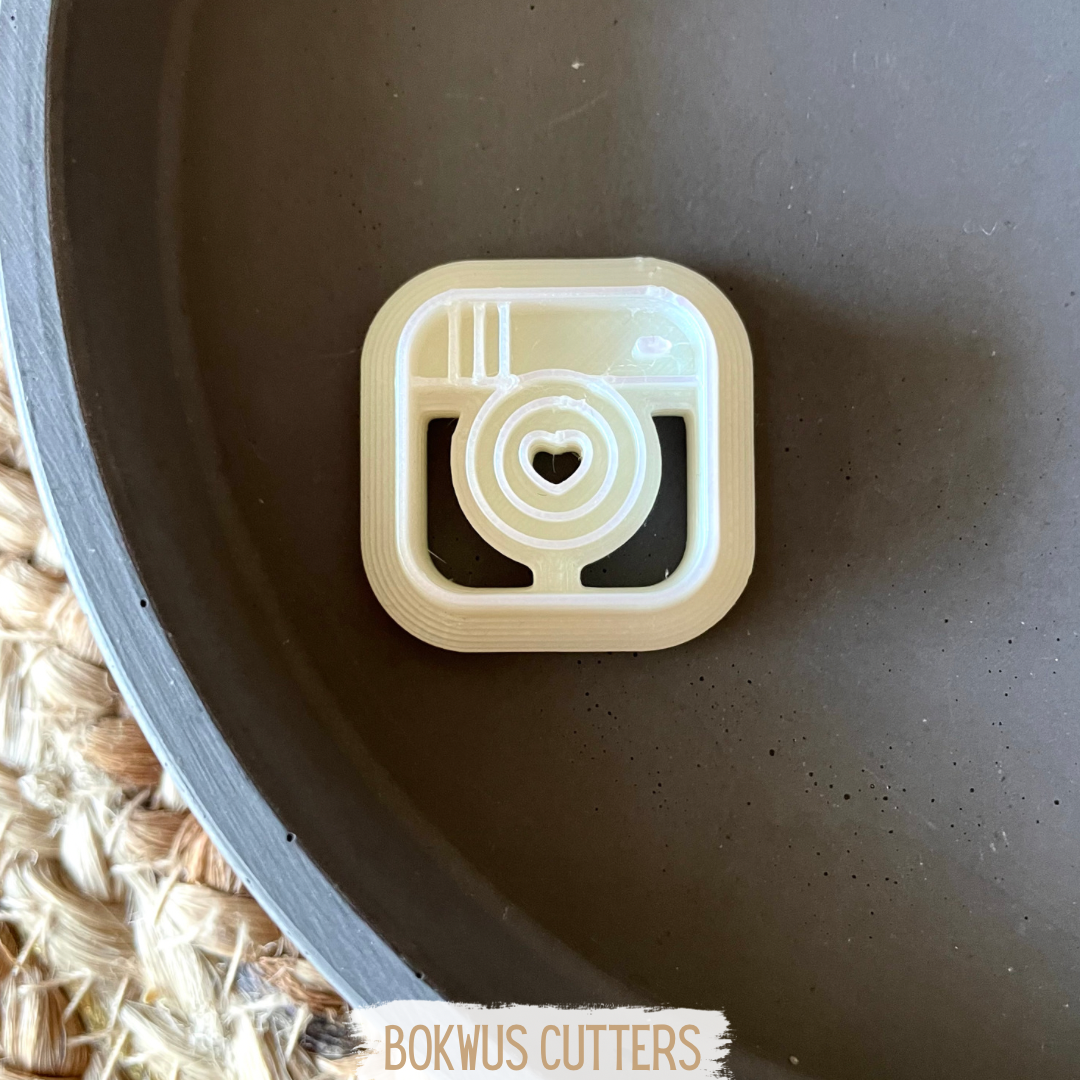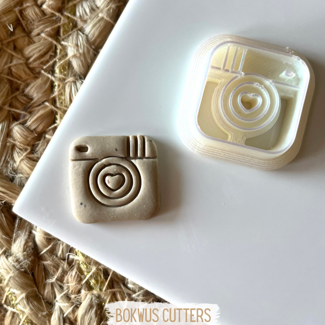 • Cortador branco em forma de câmara fotográfica com coração no centro sobre superfície cinza.