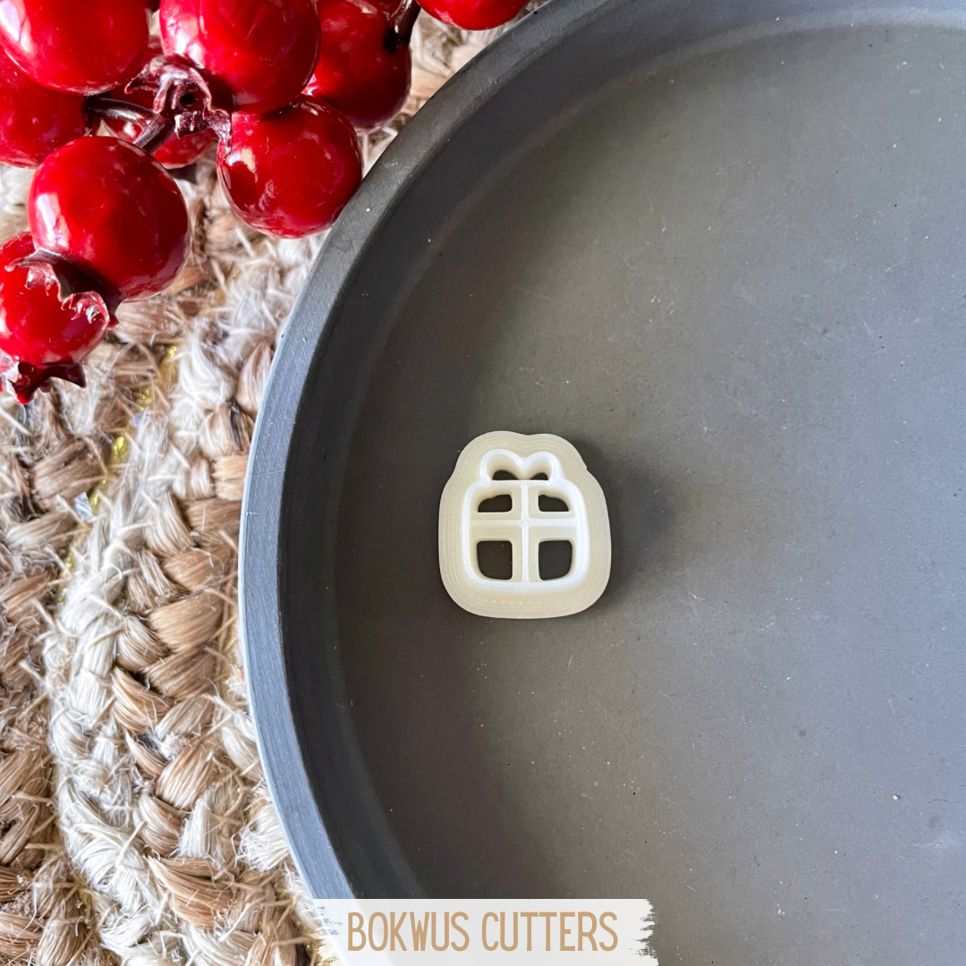 • Cortador de biscoitos em forma de presente branco numa placa cinzenta com bagas vermelhas ao lado