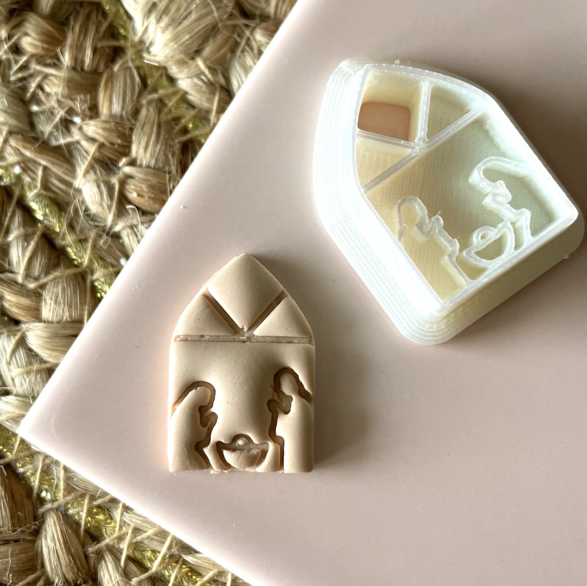 • Dois objetos em forma de janela com relevo, cores bege claro e branco, sobre superfície rosa e tapete de fibras naturais