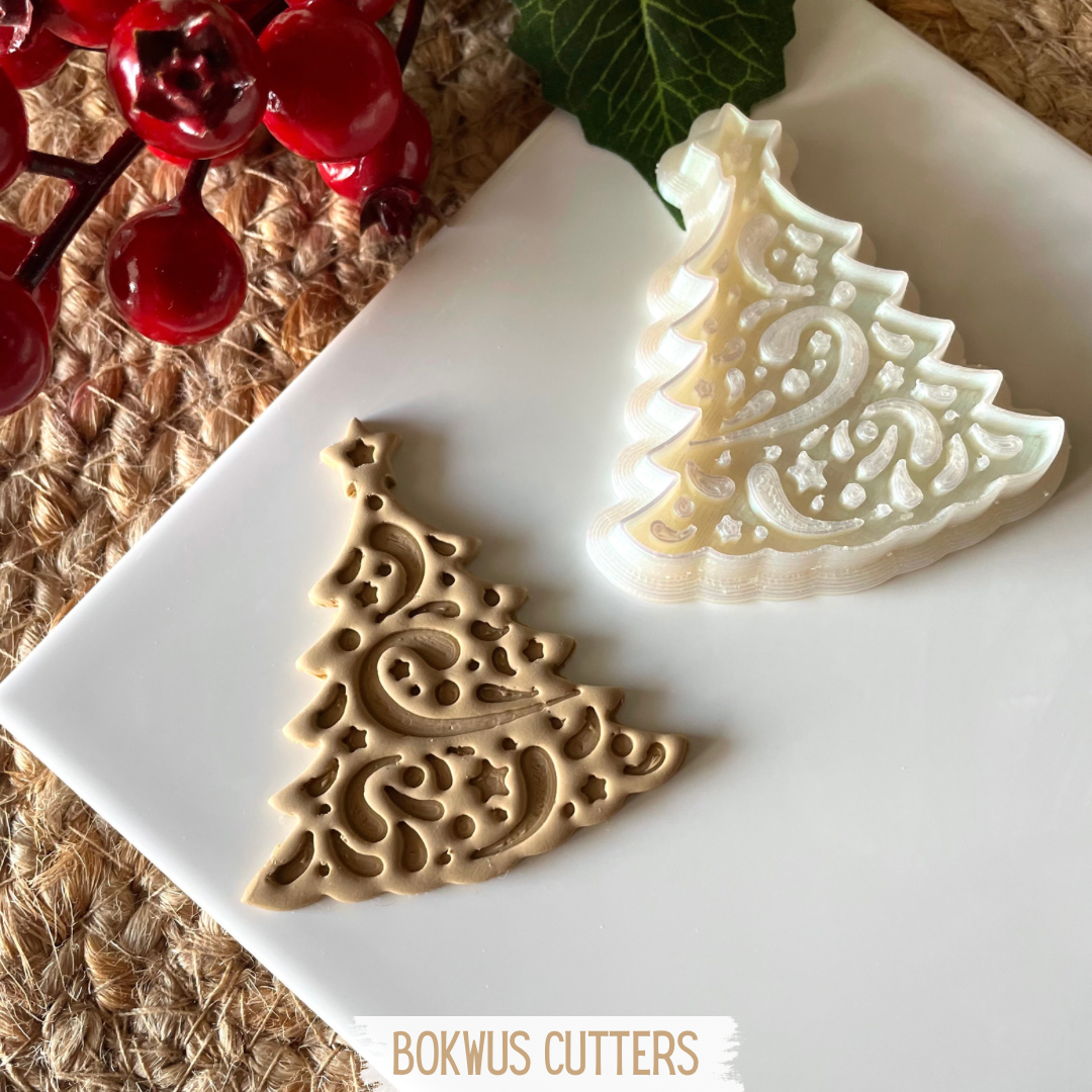 • Dois cortadores de biscoitos em forma de árvore de Natal com padrão decorativo