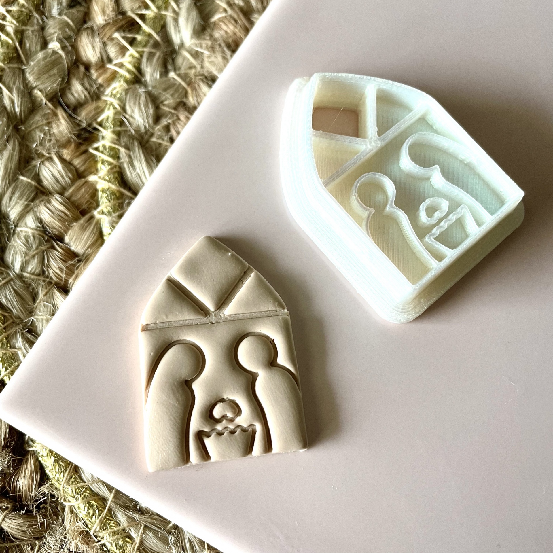 • Carimbo de plástico branco e impressão bege de presépio sobre superfície rosa