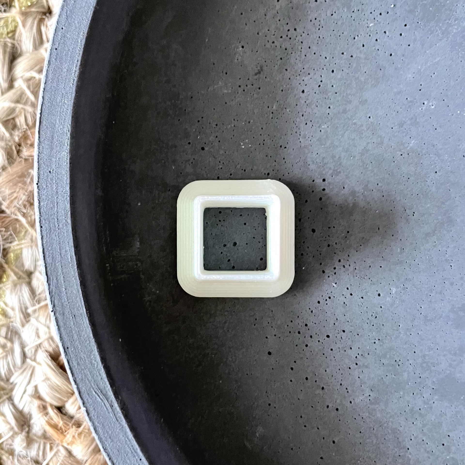 Peça quadrada branca de plástico dentro de recipiente cinza texturizado