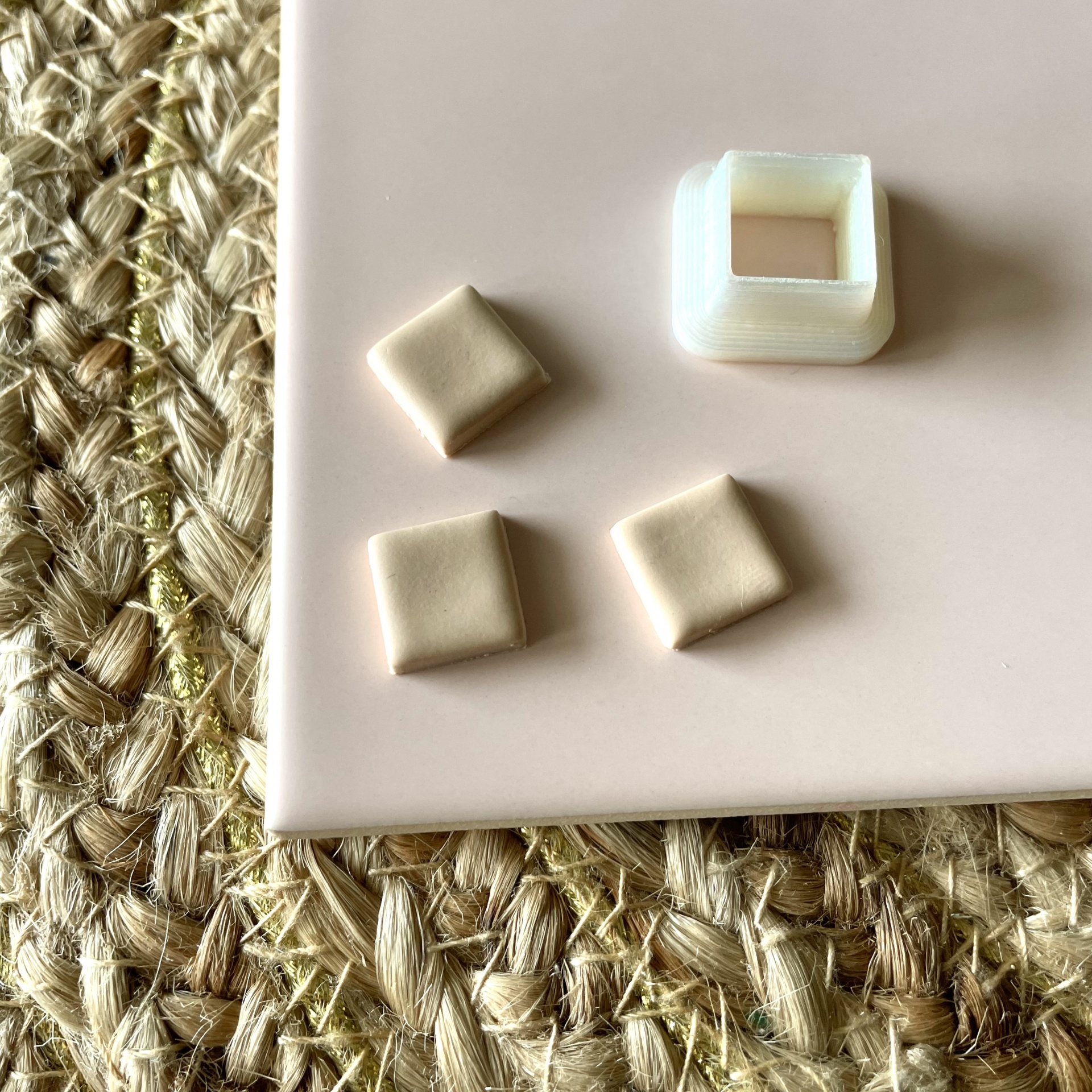 • Peças quadradas bege e branca sobre superfície bege clara e tapete de fibras trançadas