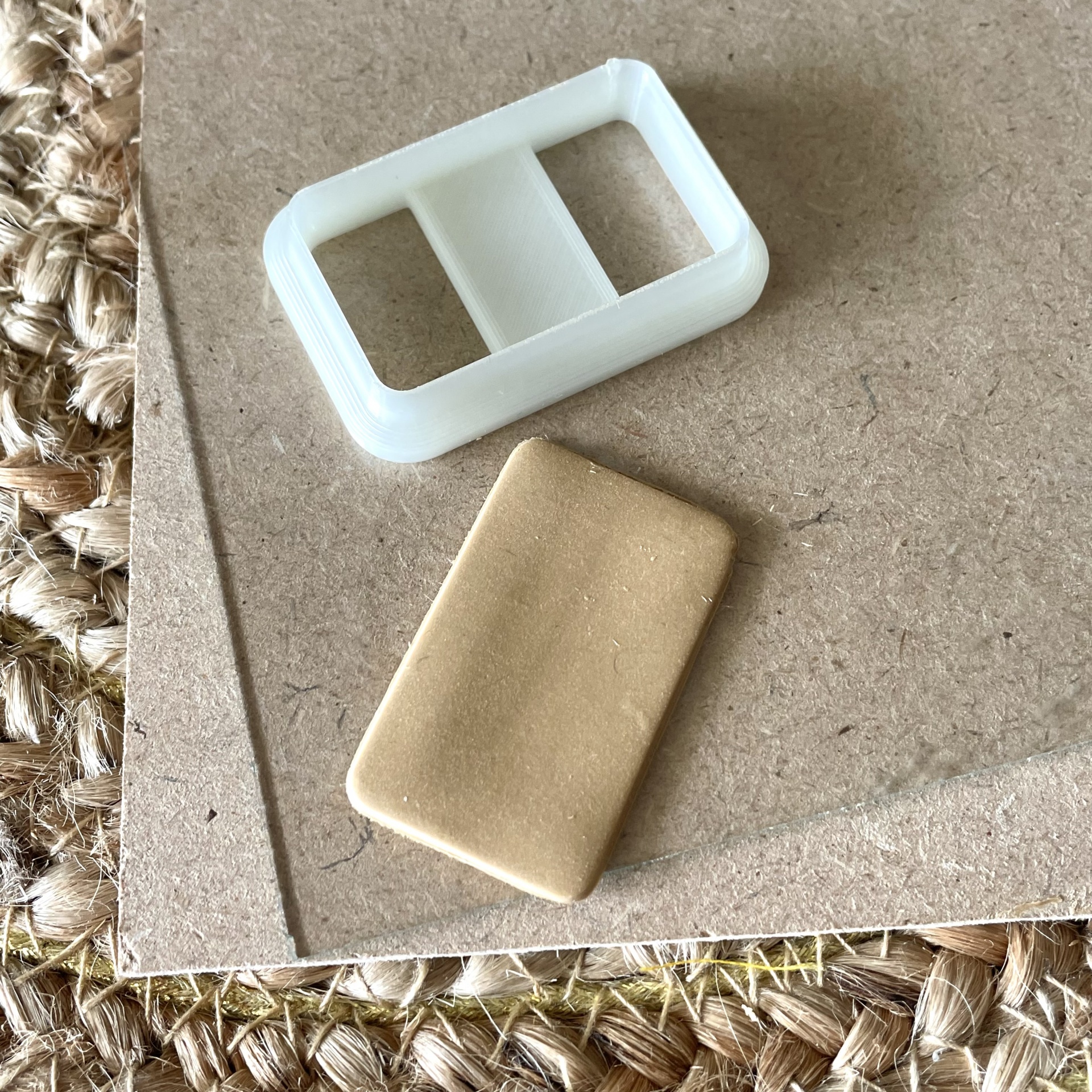 • Peças retangulares branca e bege sobre cartão castanho e tapete de palha
