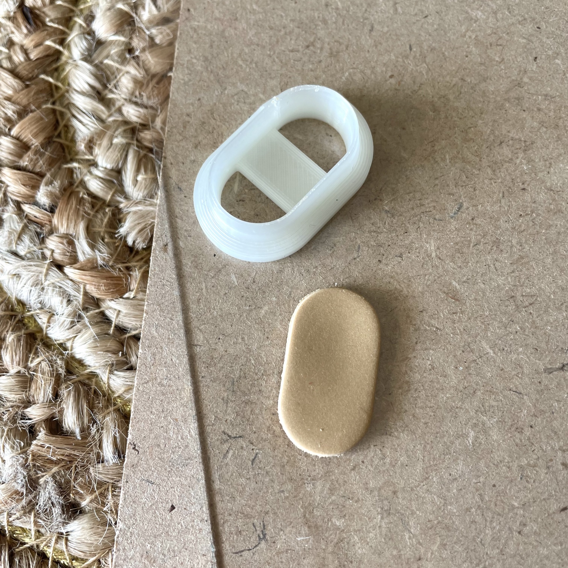 Objectos ovais branco e bege sobre cartão castanho e superfície trançada