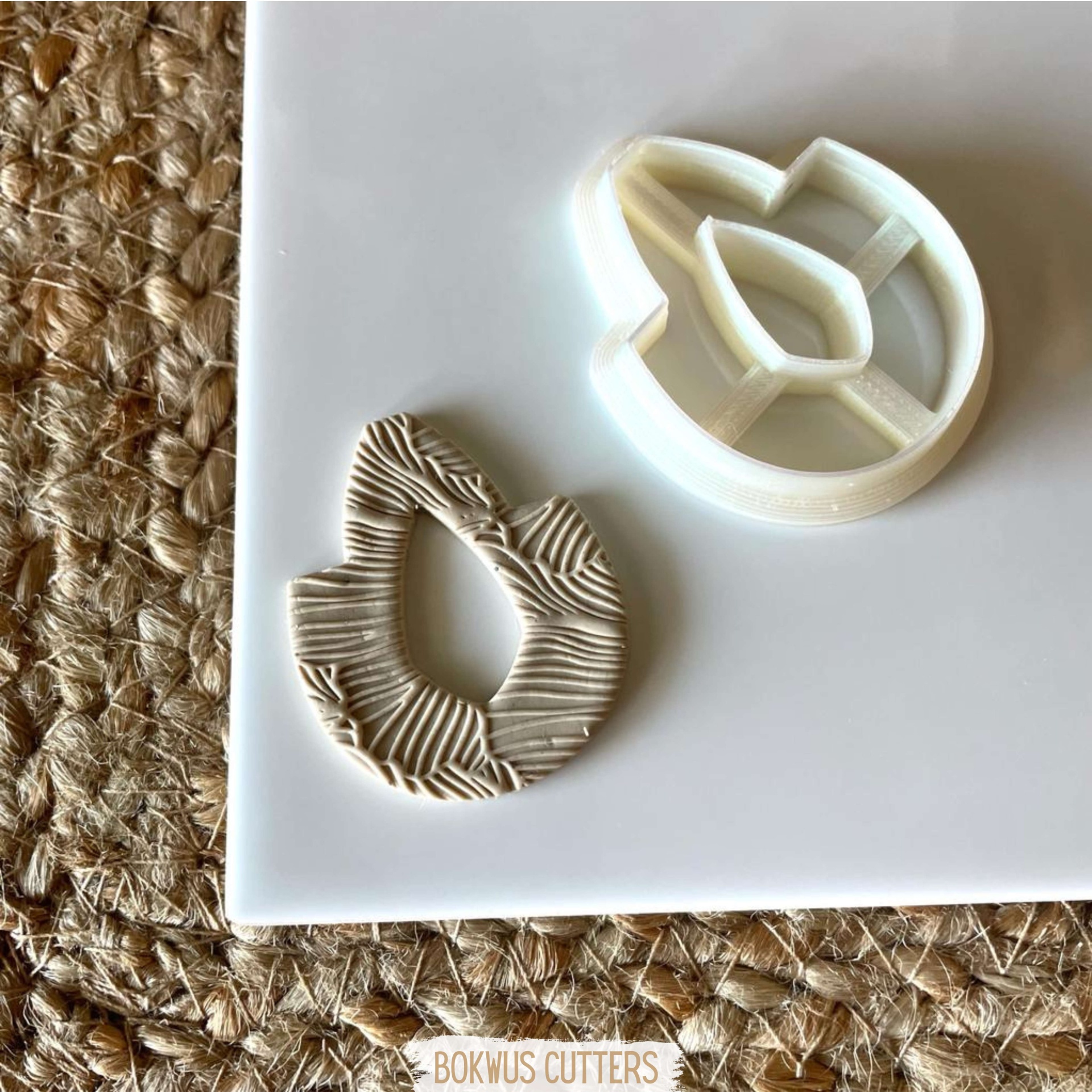 • Cortador de biscuit branco em forma de lágrima com amostra de massa texturizada