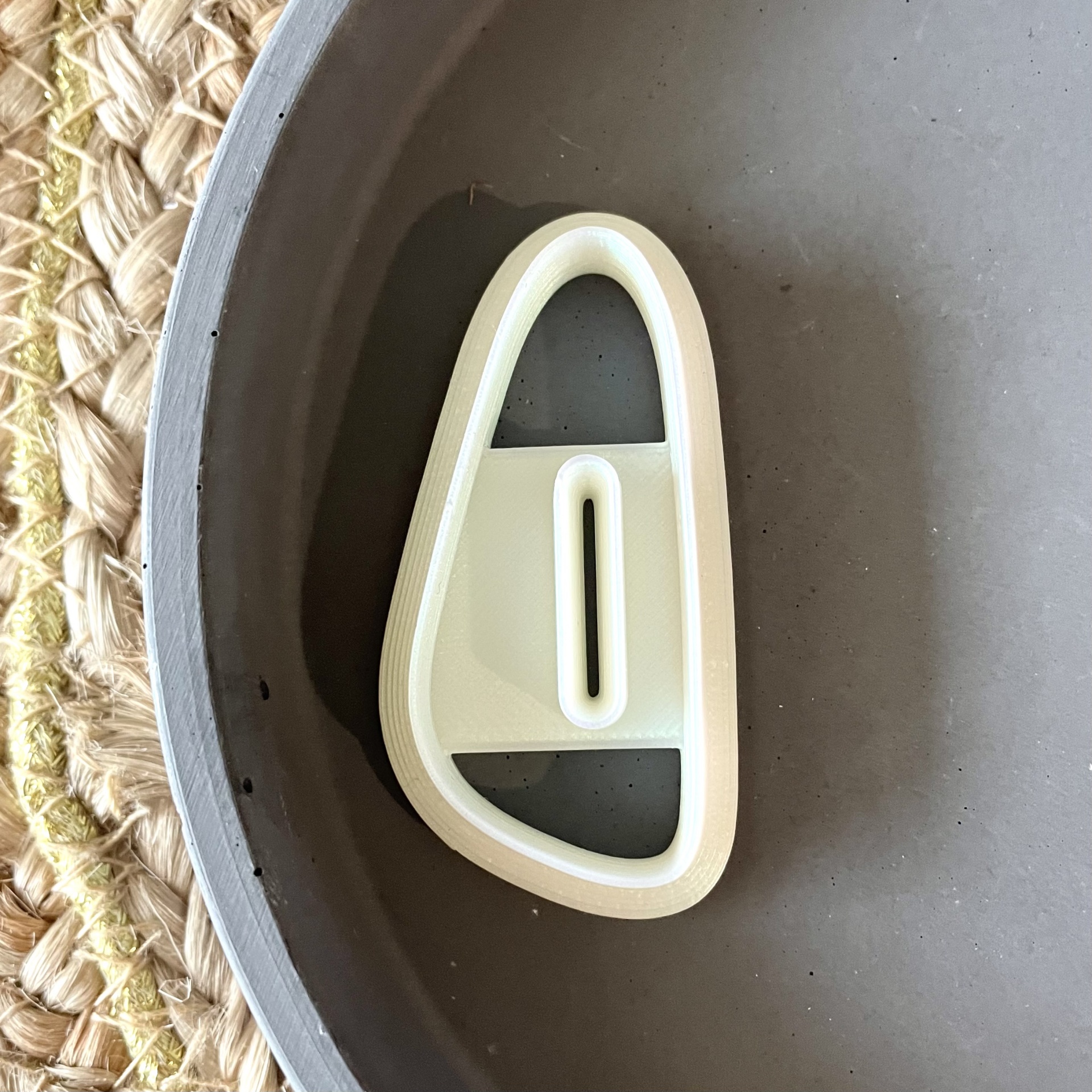 • Objeto plástico branco com formato irregular em superfície cinza sobre base trançada