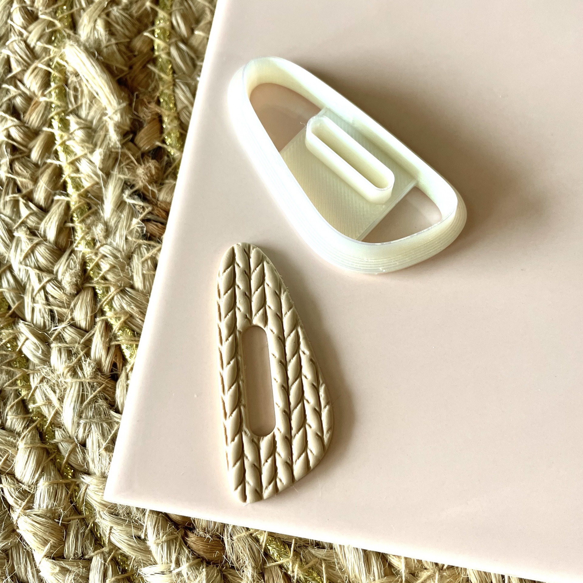 • Ganchos para cabelo bege e branco sobre superfície creme e tecido de fibras naturais