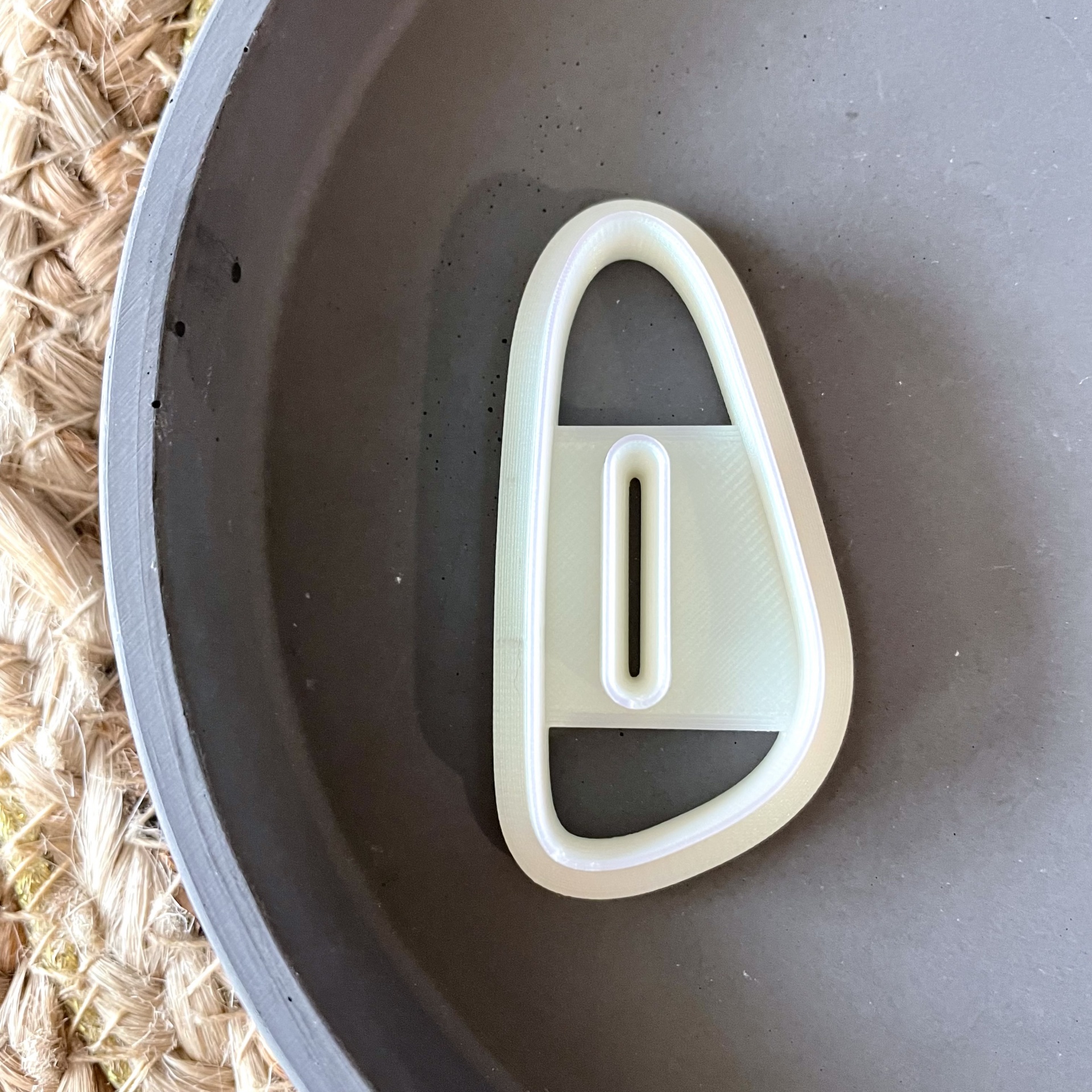 • Prendedor de roupa branco em prato cinza sobre tecido de juta