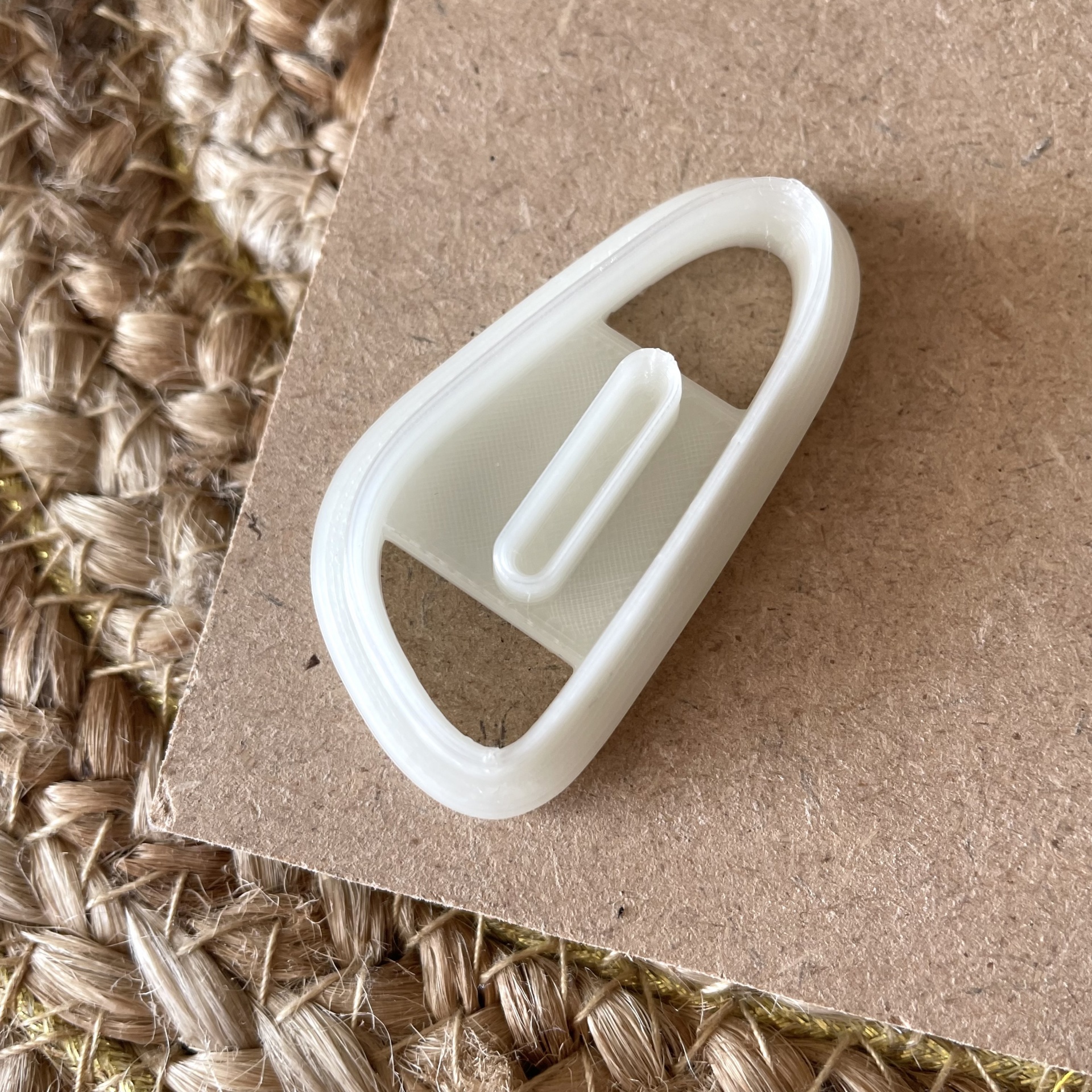 • Fivela plástica branca sobre cartão castanho e superfície tecida bege
