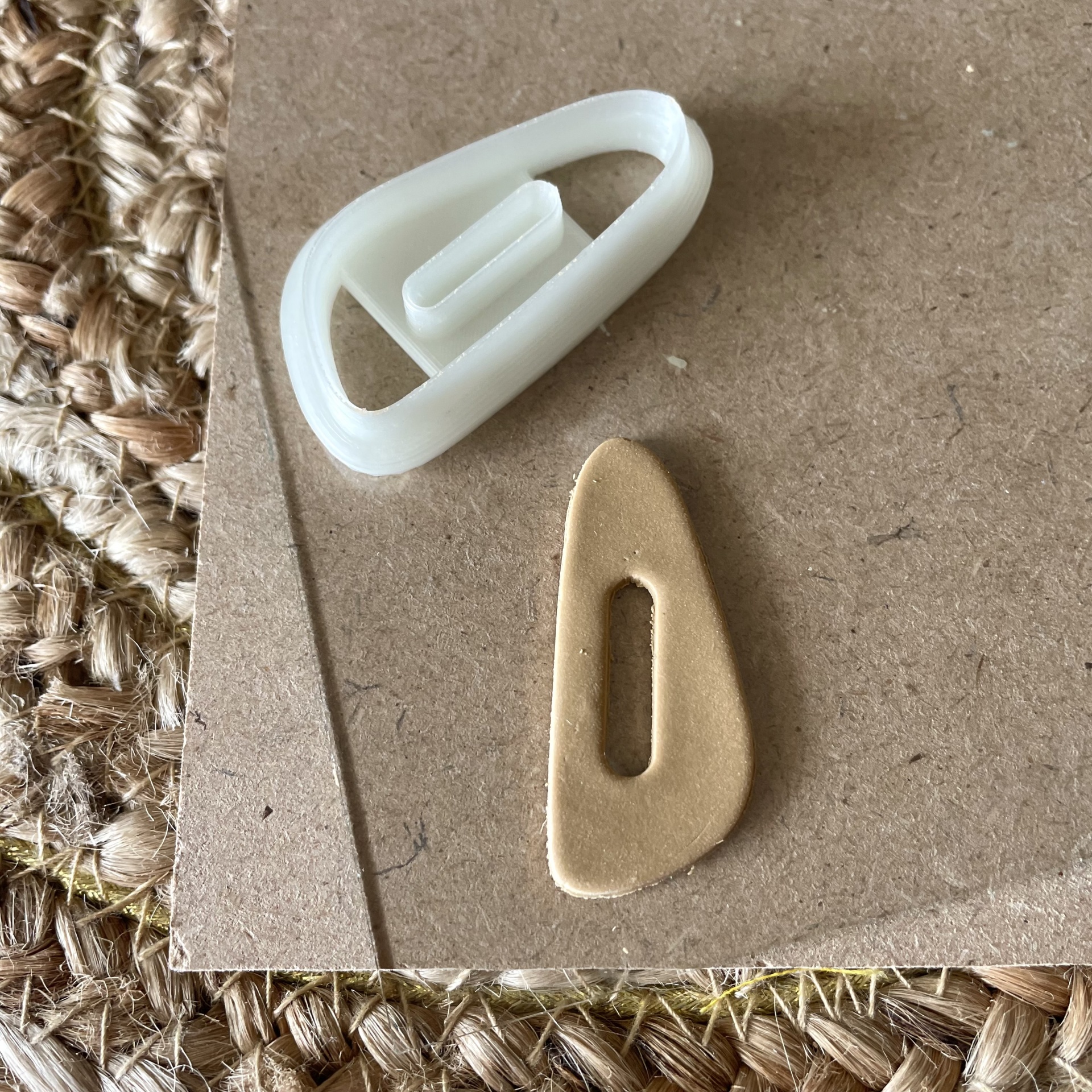 • Dois botões triangulares, um branco de plástico e um bege de tecido, sobre cartão e tapete de fibras
