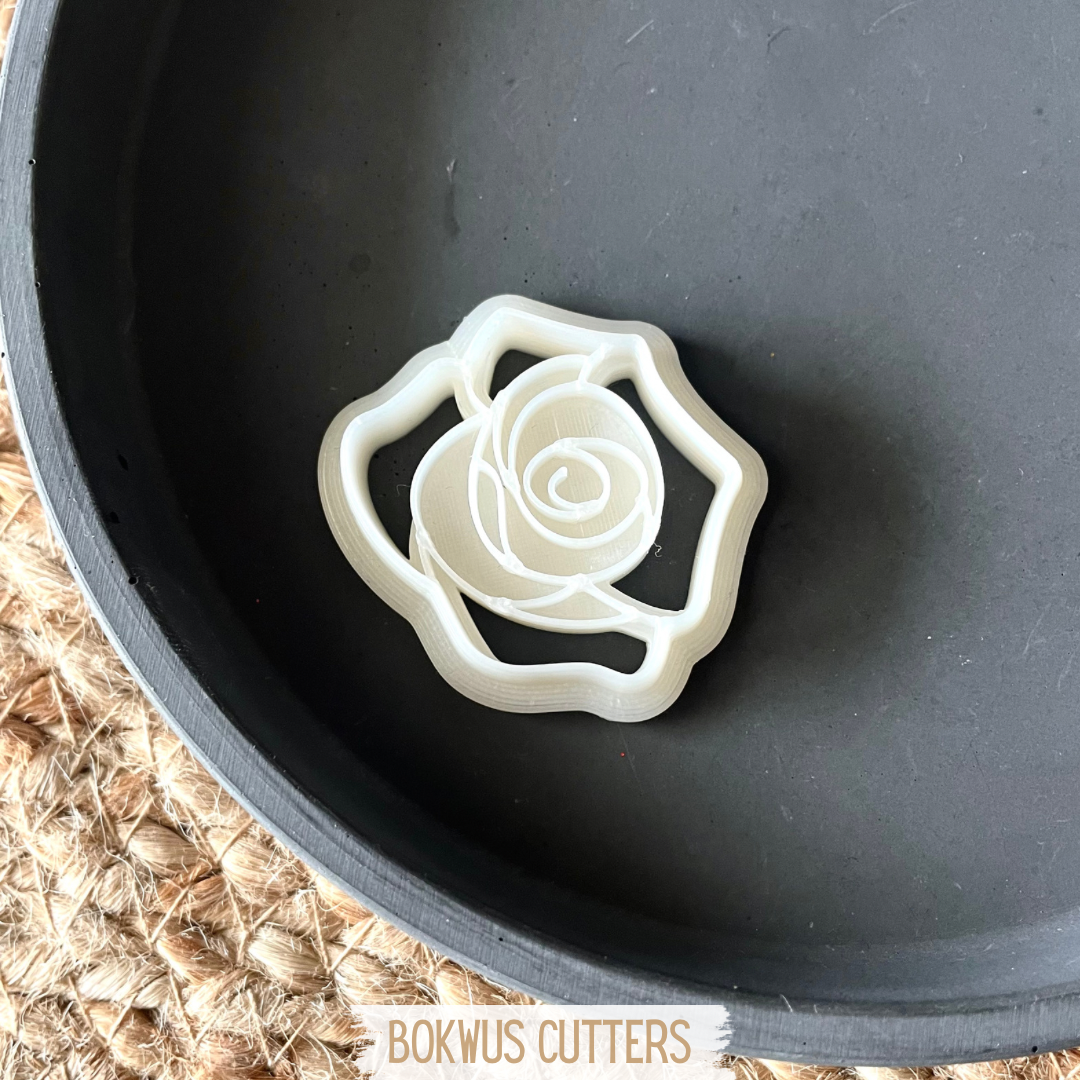 • Forma branca de cortar biscoitos em forma de rosa sobre superfície preta redonda