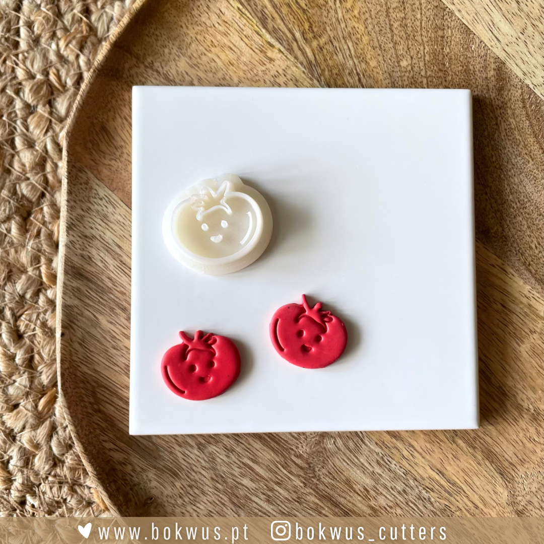 Cortador de bolachas de plástico branco em forma de tomate sorridente sobre prato cinzento