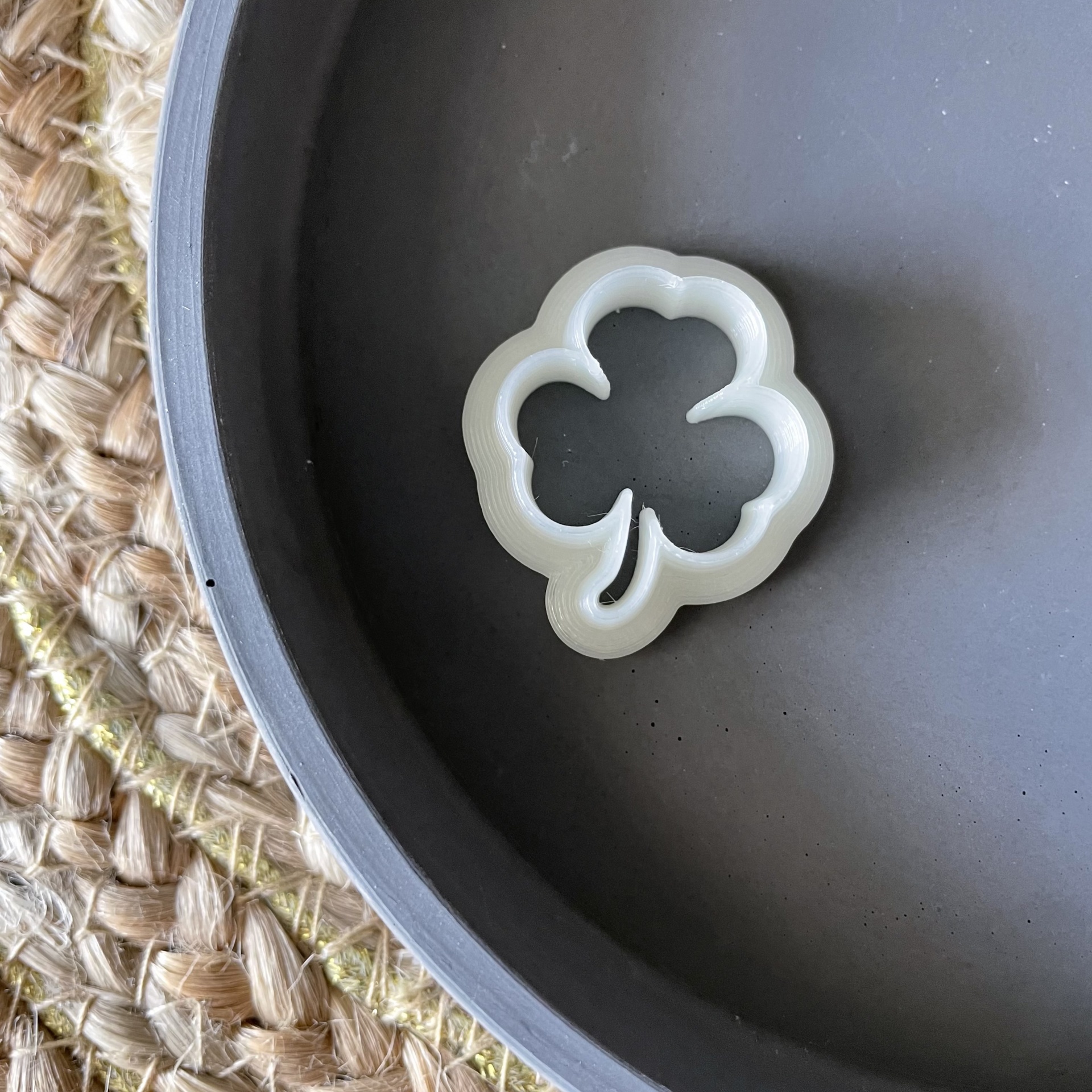 • Forma de cortar em plástico branco em forma de trevo com quatro folhas numa superfície preta