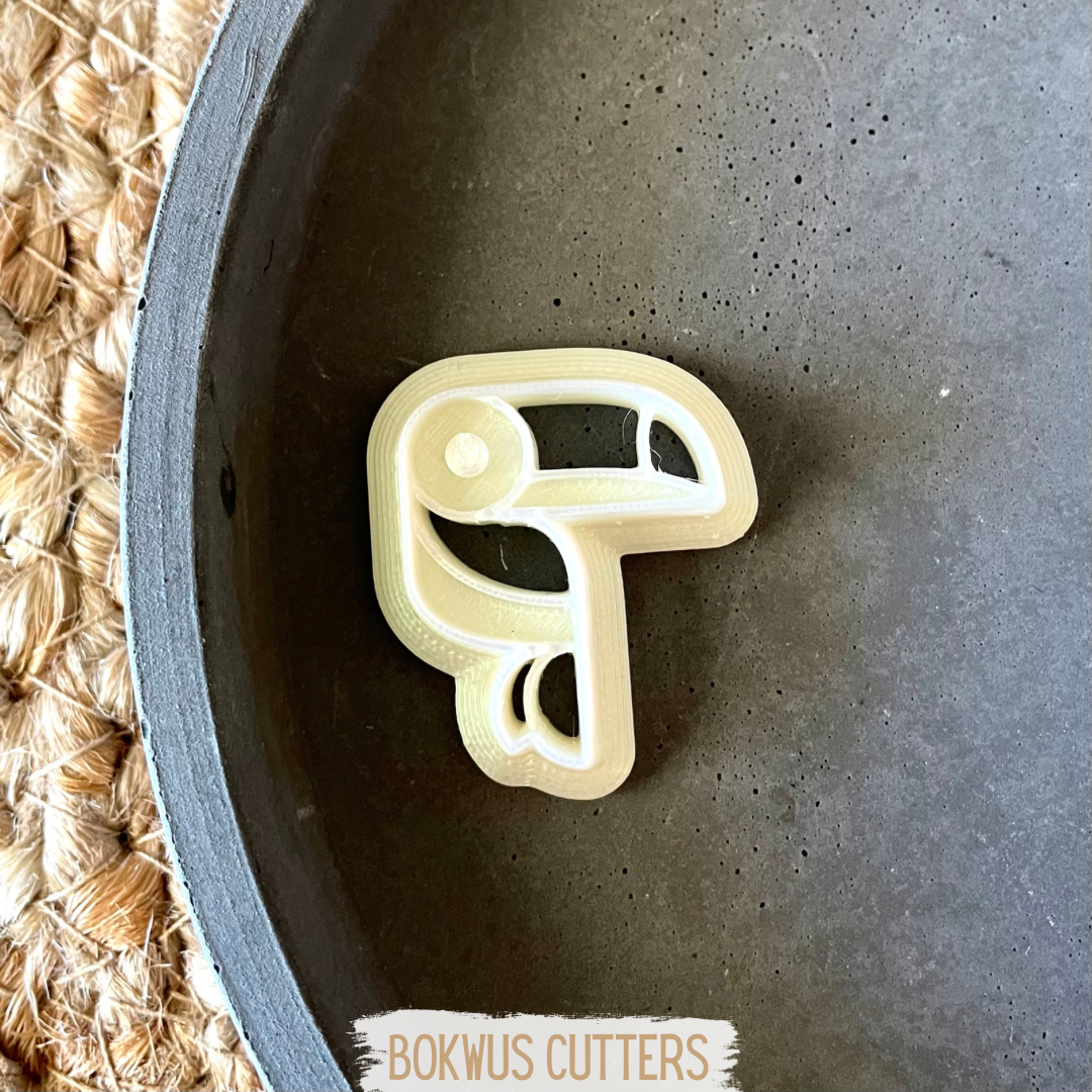 • Forma de cortar biscoitos em forma de tucano branca dentro de um prato cinza