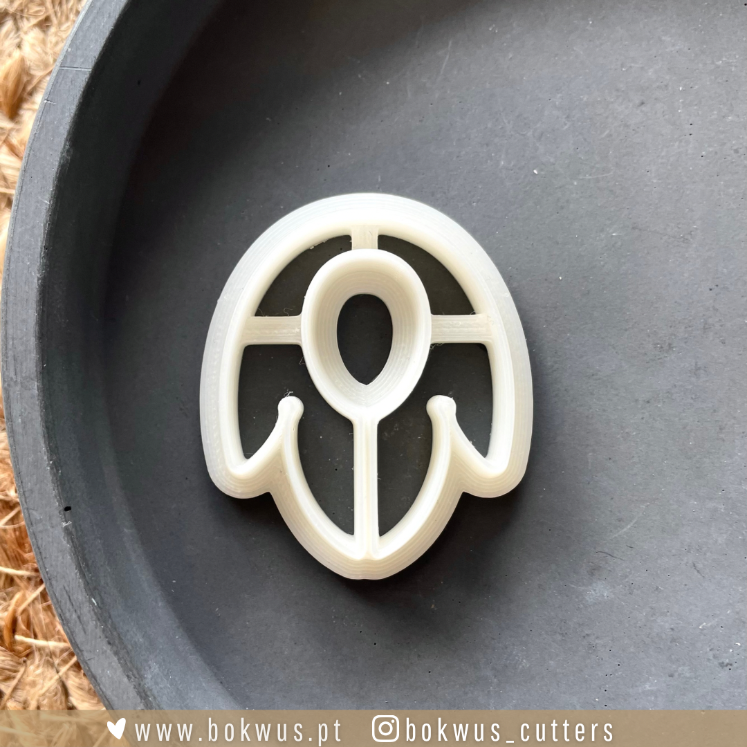• Cortador de bolachas em plástico branco com padrão de pétalas e folha em prato preto