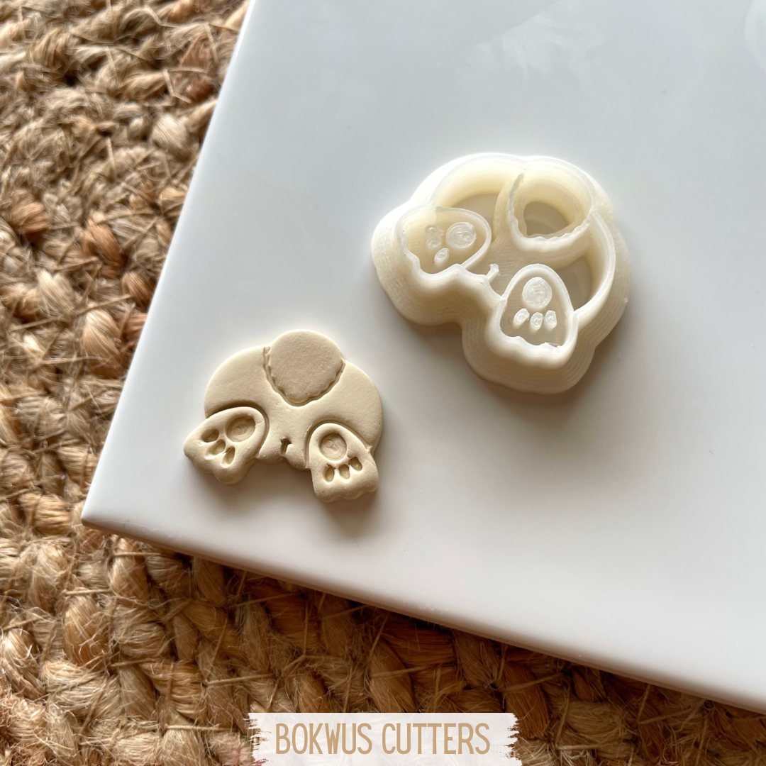 • Dois cortadores creme para massa em forma de crânio e patas sobre fundo branco e fibra natural