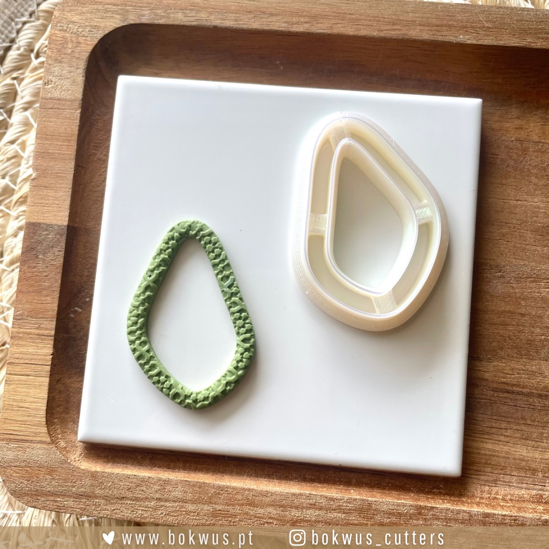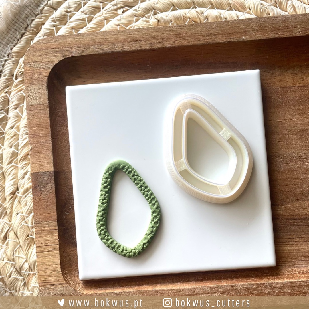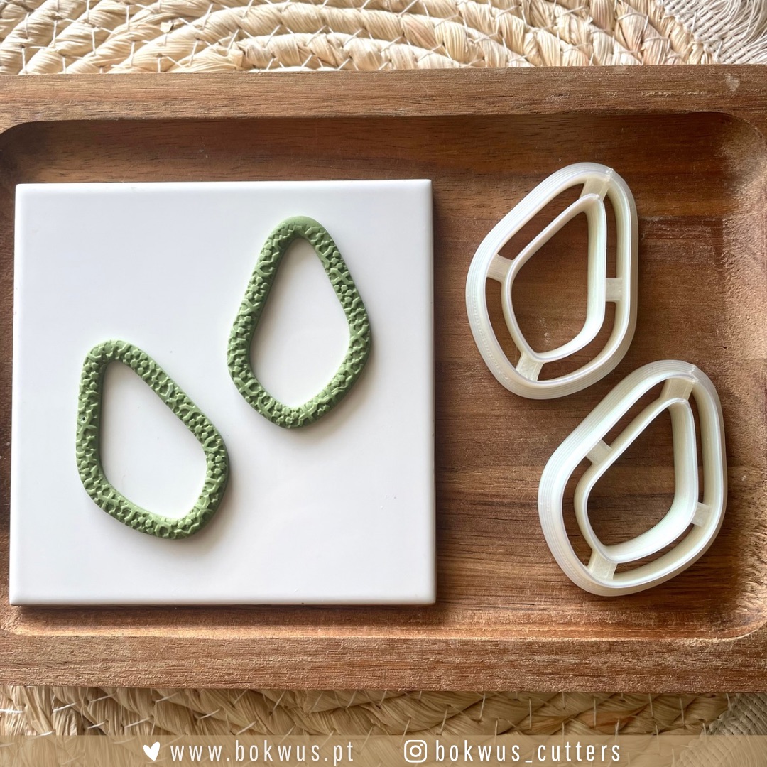 Cortadores em formato orgânico e assimétrico para criar brincos modernos e minimalistas em cerâmica plástica, disponíveis individualmente ou em conjunto.