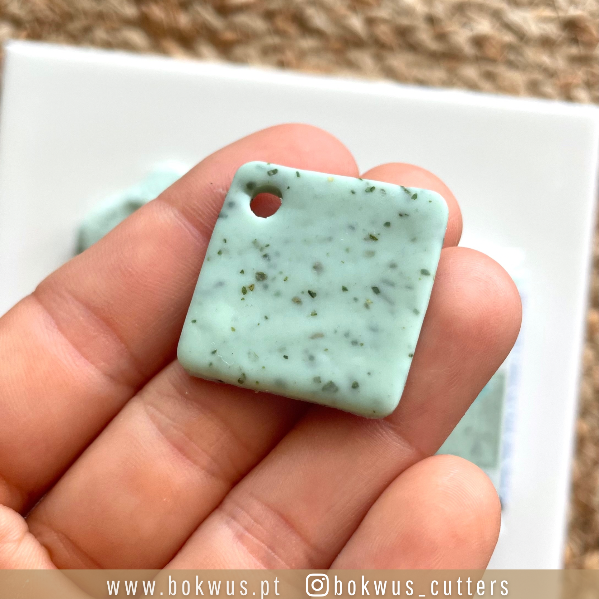 • Peça quadrada verde água com manchas pretas e orifício num canto, segurada por uma mão
