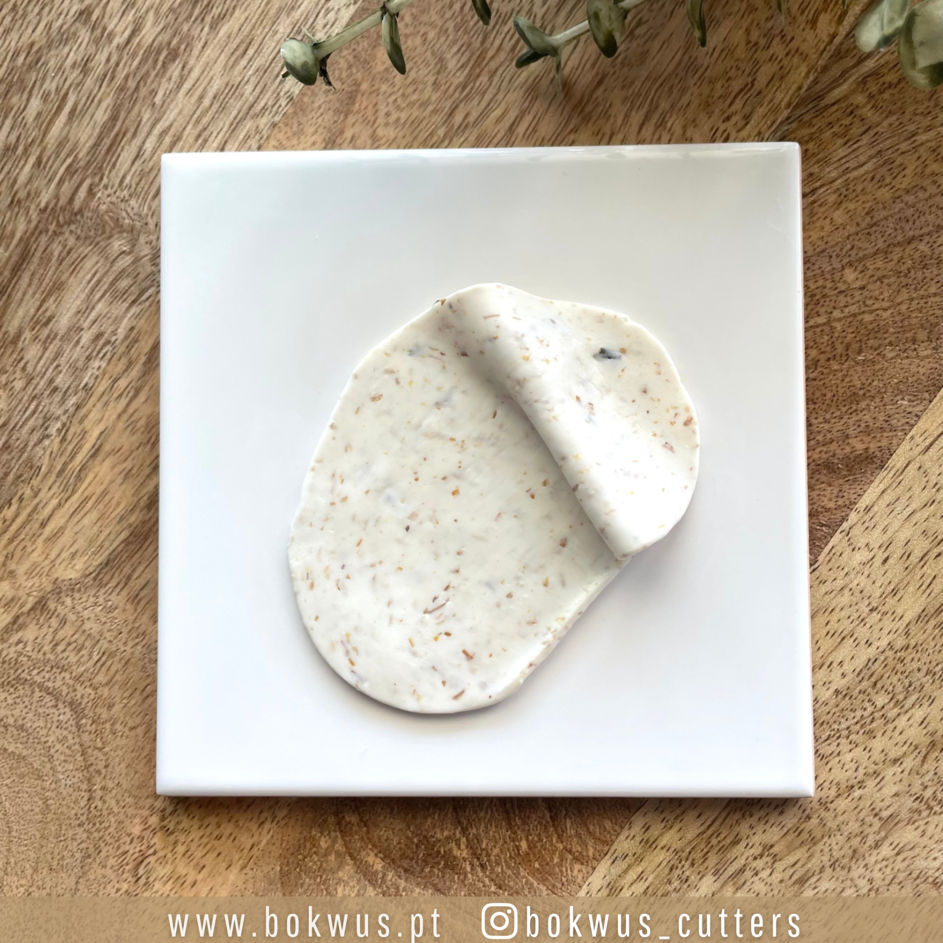 • Cortador de massa branco com textura sobre prato quadrado branco numa superfície de madeira.