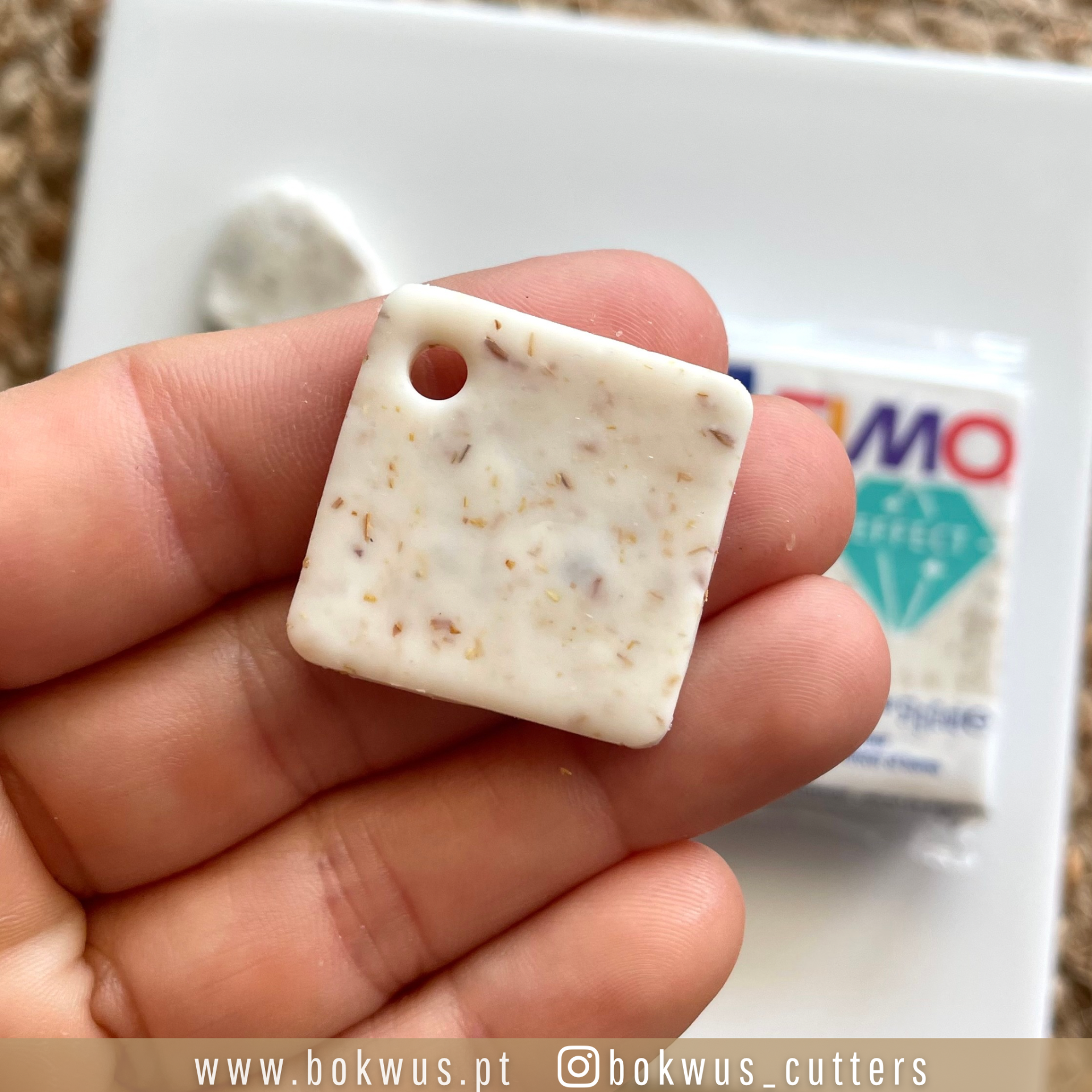 • Peça quadrada branca com partículas castanhas e furo, segura por uma mão