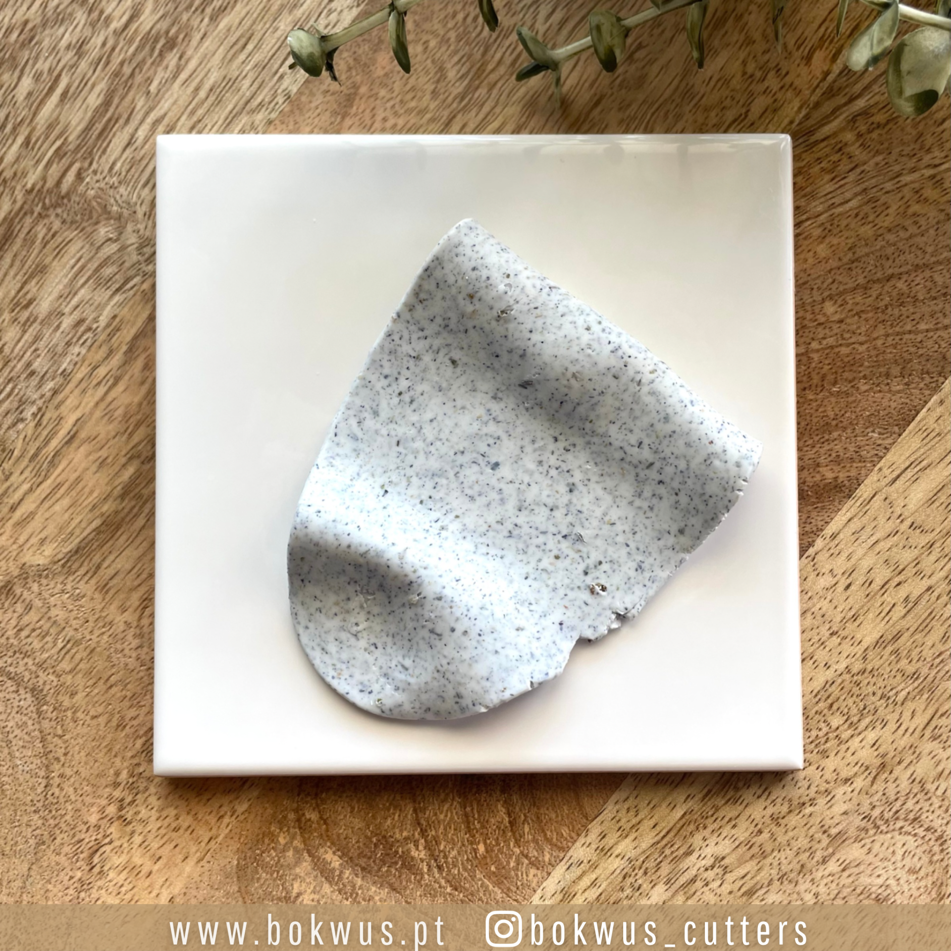 • Pegada de escultura branca com pontos pretos sobre placa branca em superfície de madeira