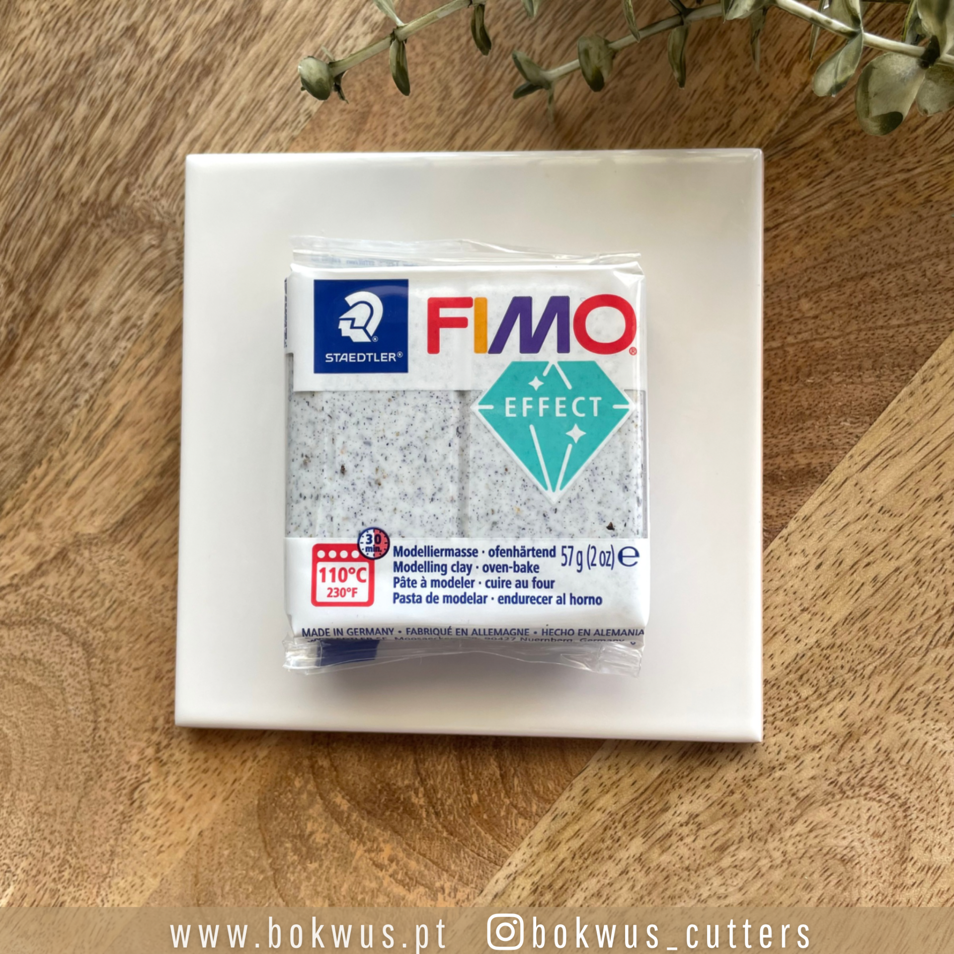 • Massa de modelar FIMO Effect branca com pontos pretos numa embalagem transparente colocada numa placa branca sobre madeira clara.