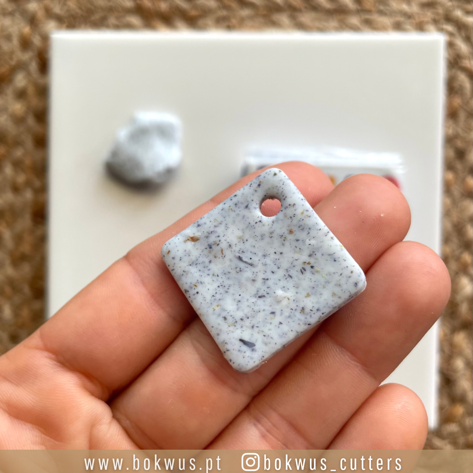 • Colar quadrado cinzento marmoreado com furo num canto segurado na mão