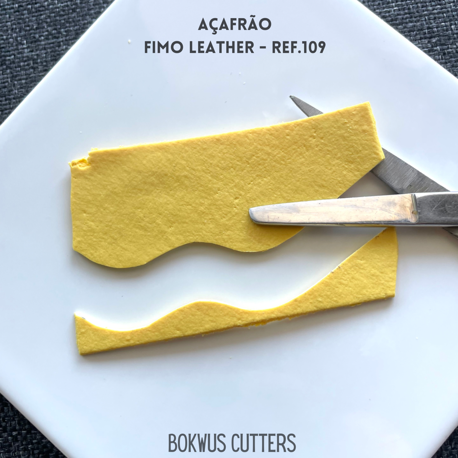 • Placa amarela de Fimo Leather açafrão com faca e lâmina sobre prato branco