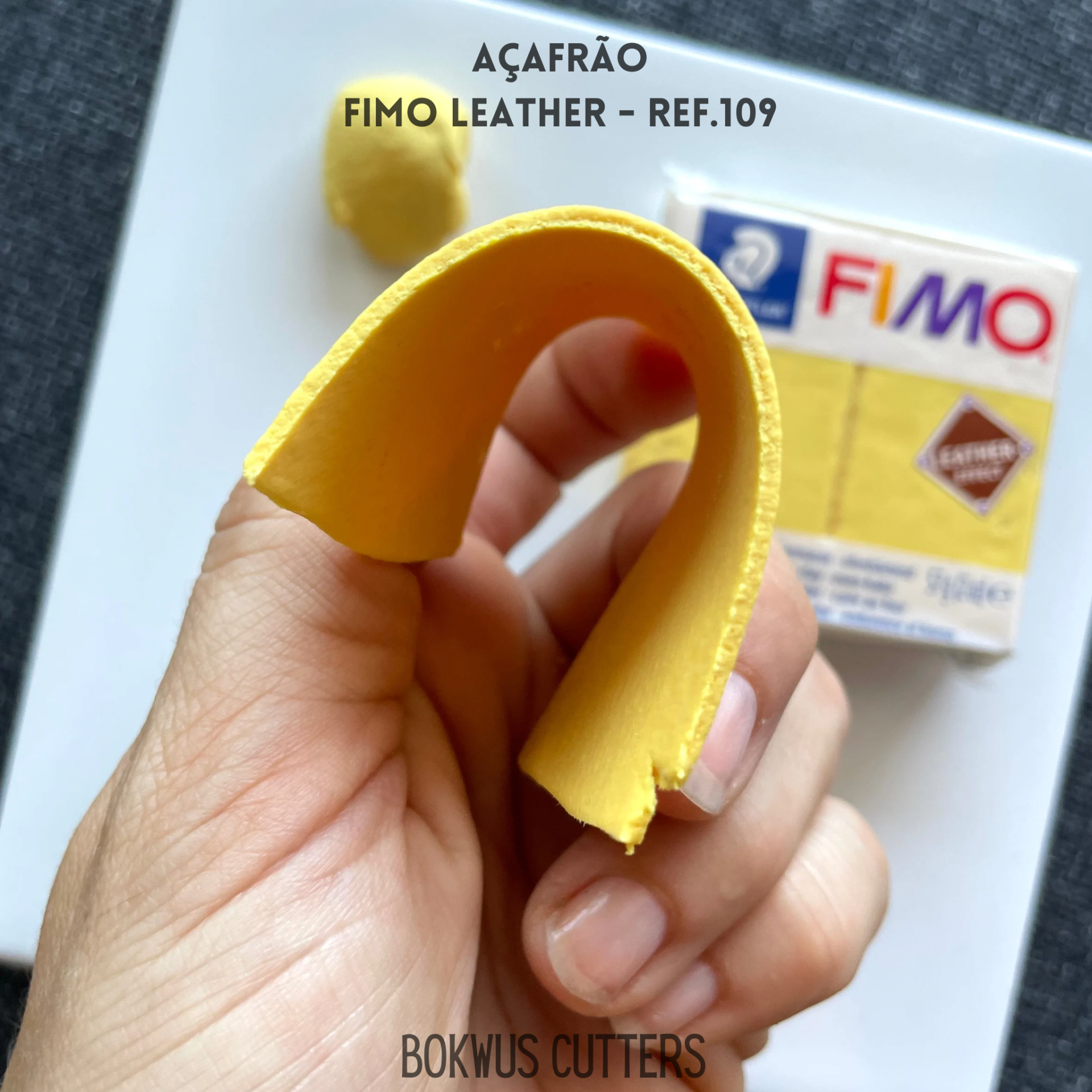 • Mão a segurar tira amarela de FIMO Leather com embalagem ao fundo
