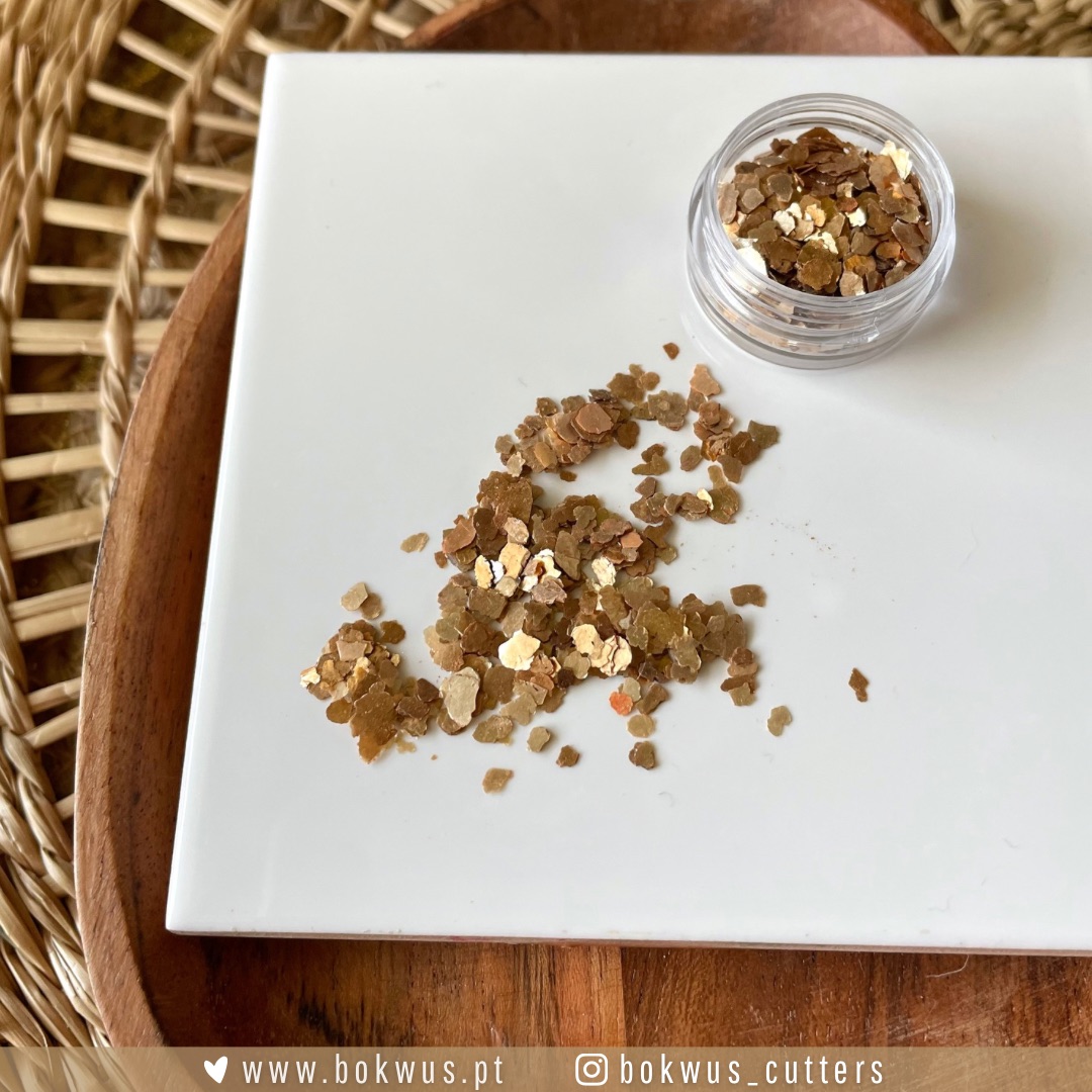 Disponíveis em dourado e prateado, estas escamas são ideais para quem procura detalhes metalizados. Aplicam-se sobre as peças já cozidas, para um efeito visual mais luminoso e com profundidade, após a cura com resina.
