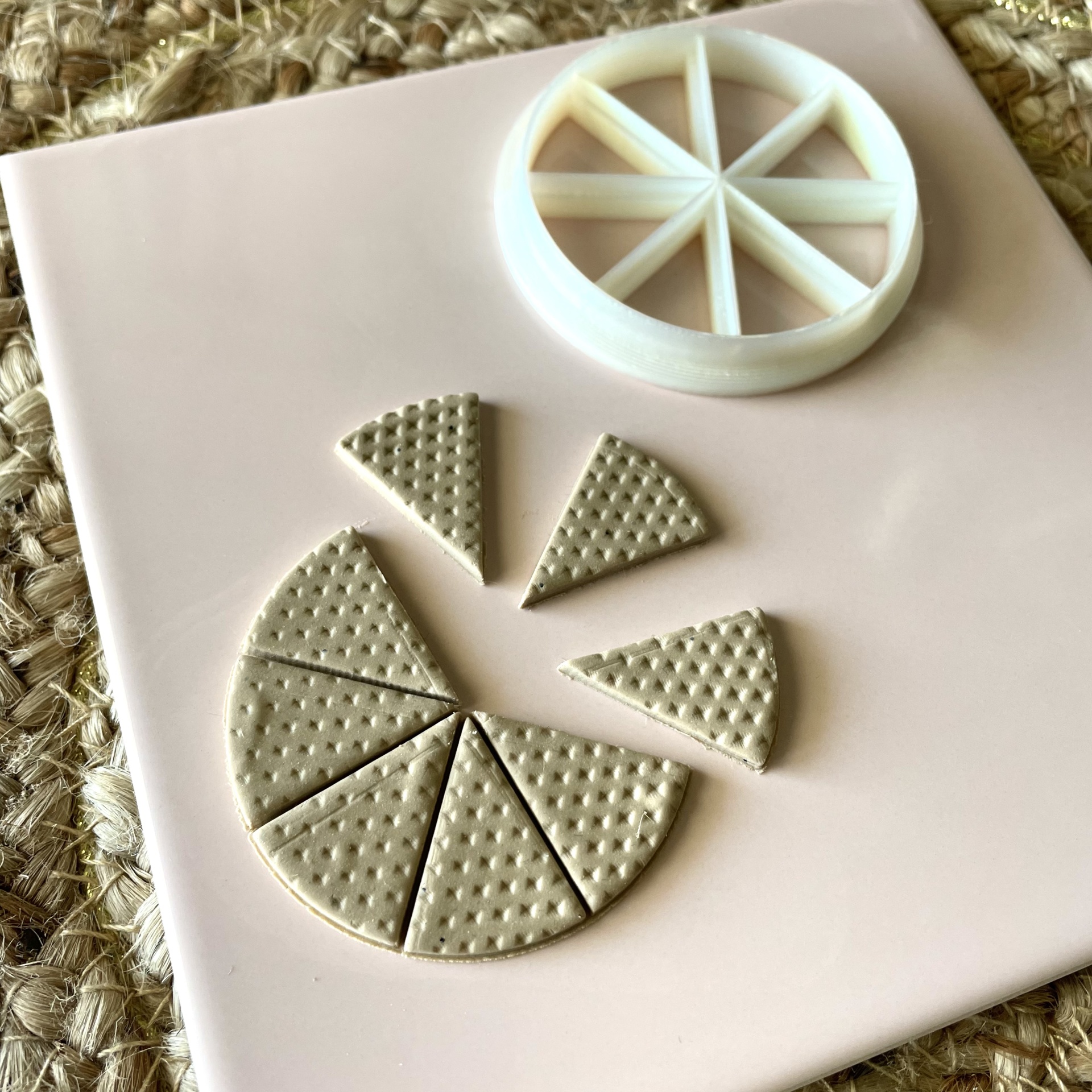 • Molde branco redondo com divisões e pedaços triangulares texturizados sobre placa rosa