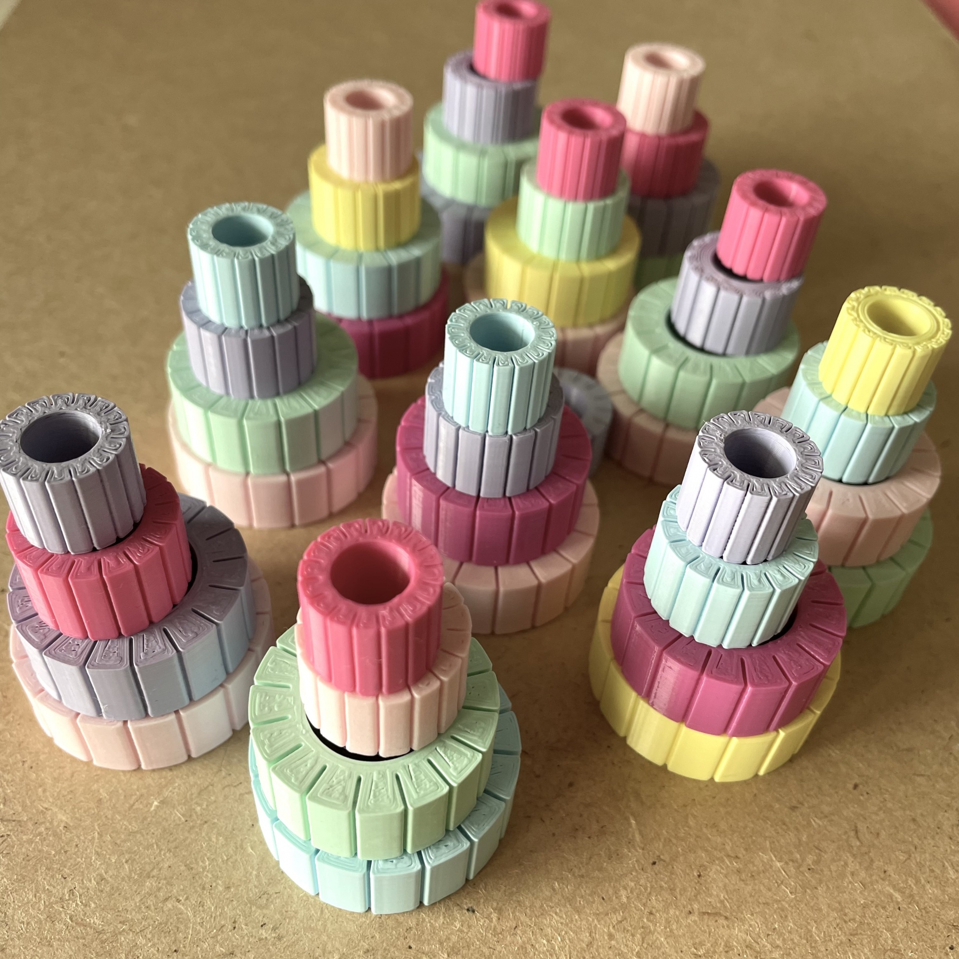 • Torres de anéis coloridos empilhados em cores pastel sobre fundo castanho