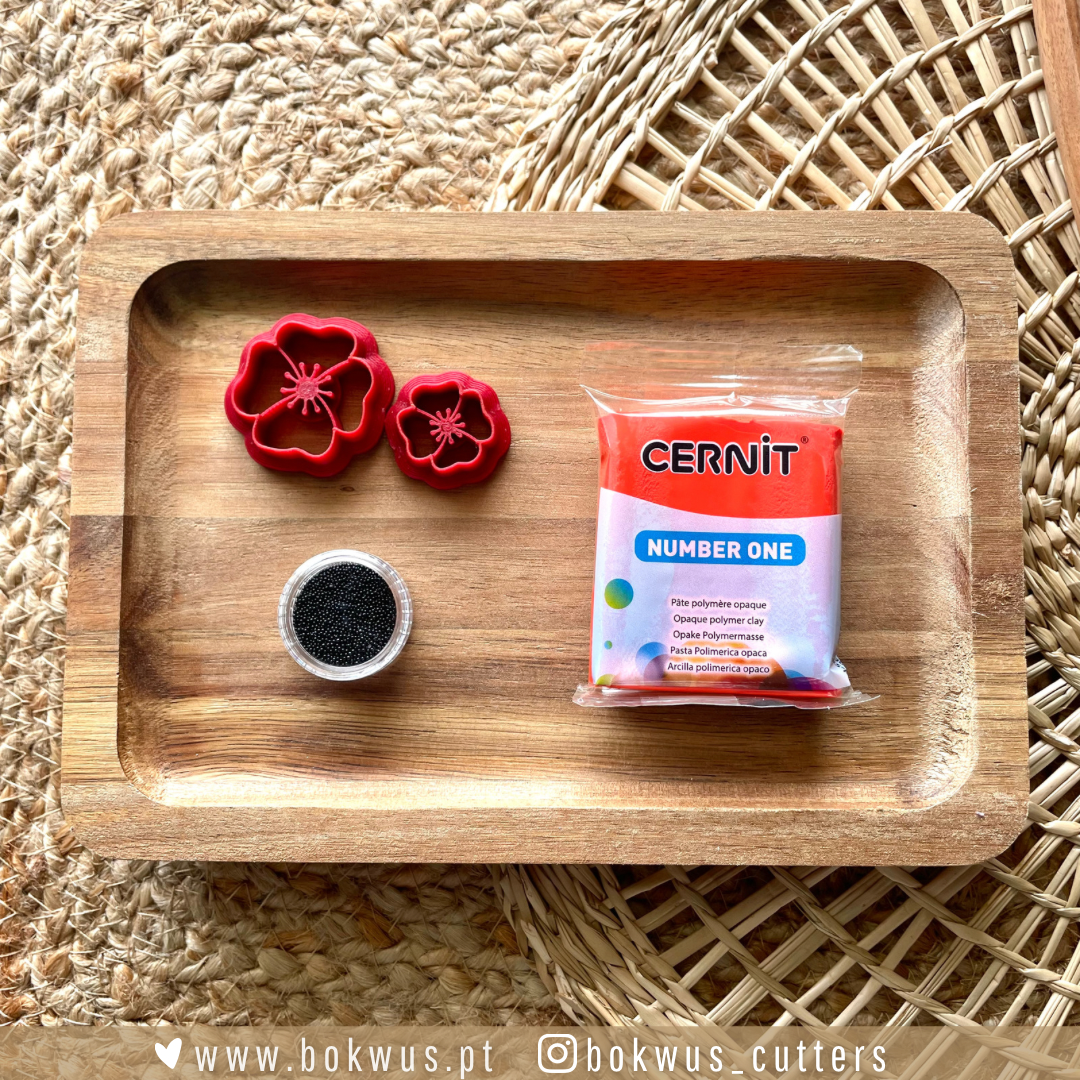 • Embalagem Cernit Number One salmão, formas vermelhas de flor e recipiente de contas pretas num tabuleiro de madeira