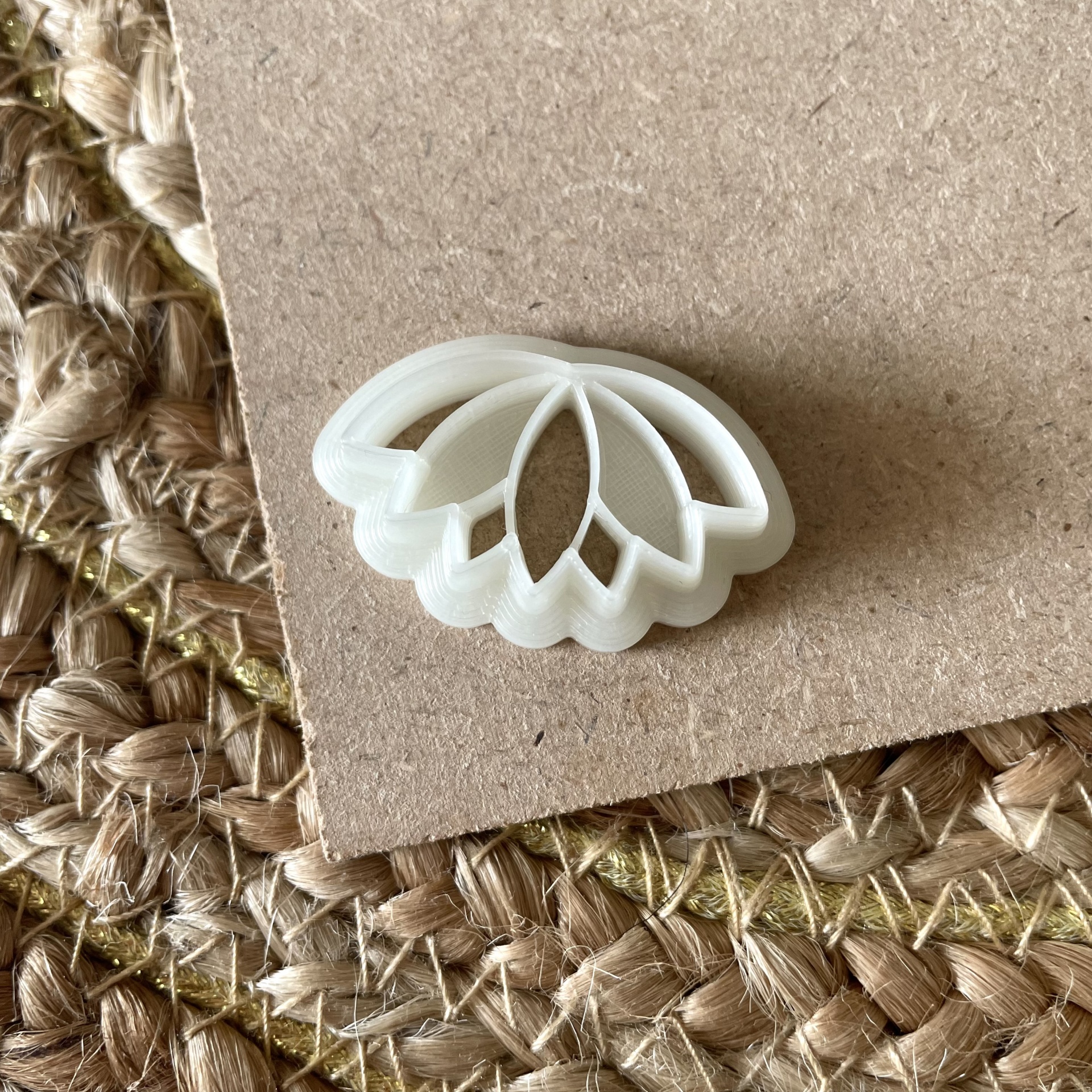 • Cortador de biscoitos branco em forma de pétalas em fundo de palhinha